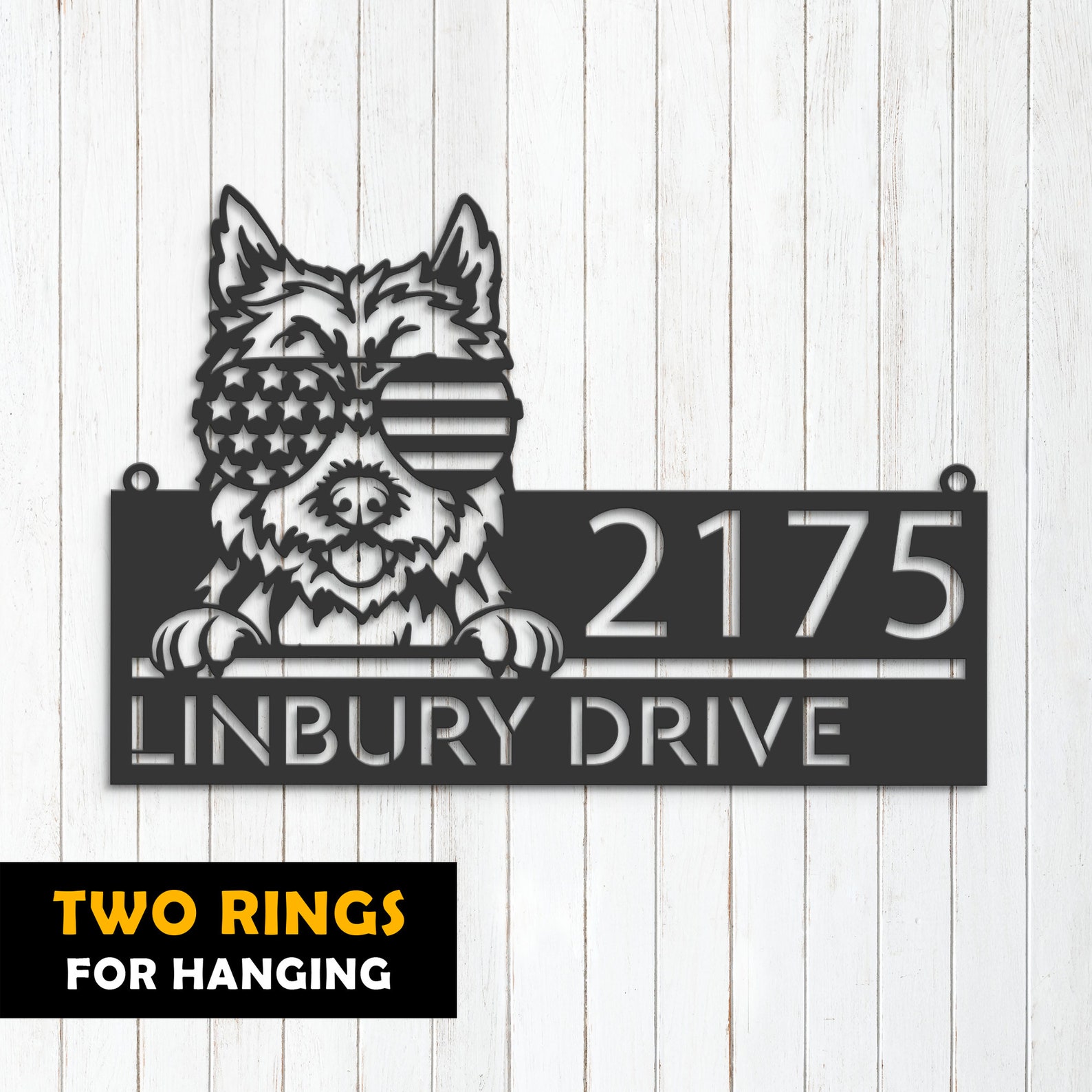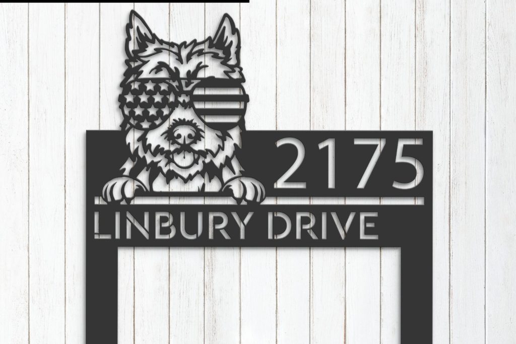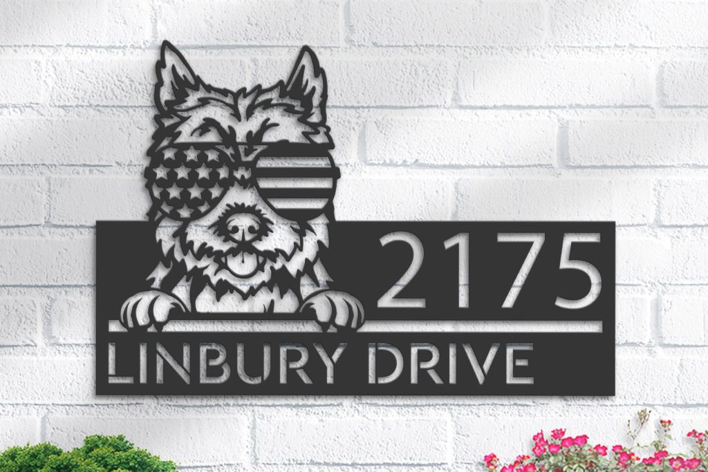 Be the first to review “Cairn Terrier with US Flag Glasses Metal Address Sign”