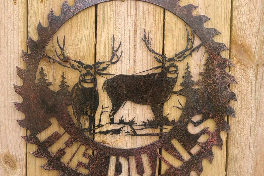 This custom metal personalized monogram sign with elk saw blade can be personalized with your family name or any name you would like. Please be sure to add name in personalization box below!