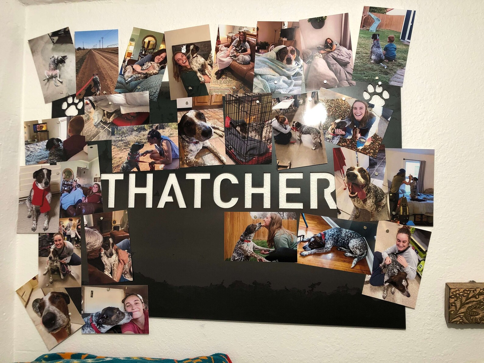 This custom magnetic board is customized with your pet9;s name. Use it to display photos, notes, magnets, and any other memories you want to look at every day! Item is 18in x 24in.