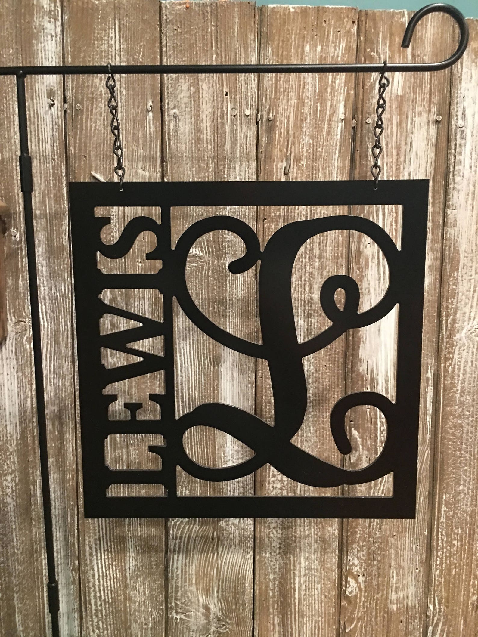 Dress your front yard up with your family name with this Monogram Metal ACM Name Garden Flag. Designed to be an elegant piece of yard decor, this front yard sign proudly boasts your family name and initial while looking elegant and classy! This custom name sign will not only withstand the test of time but also the elements with its aluminum composite material body. Create yours as a wreath accessory for your front door.