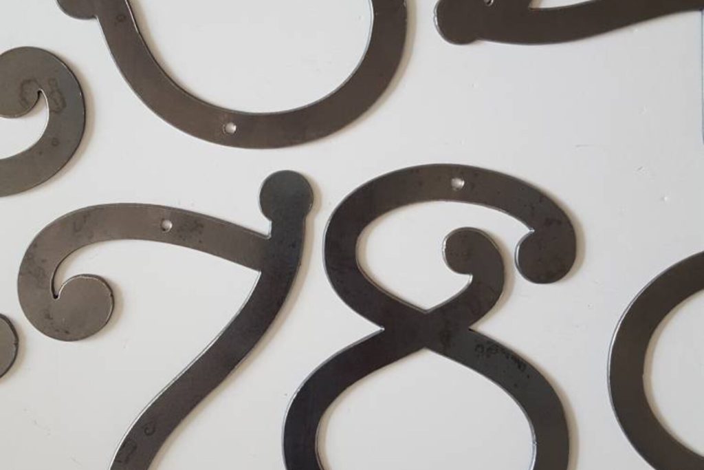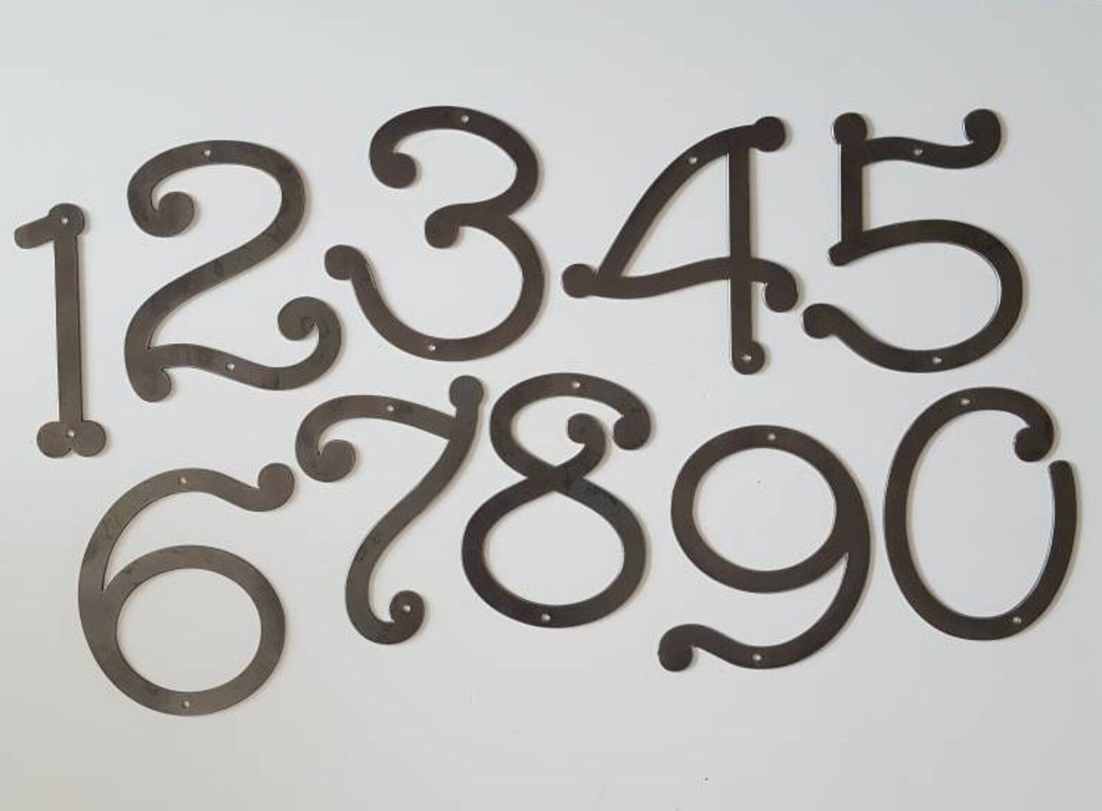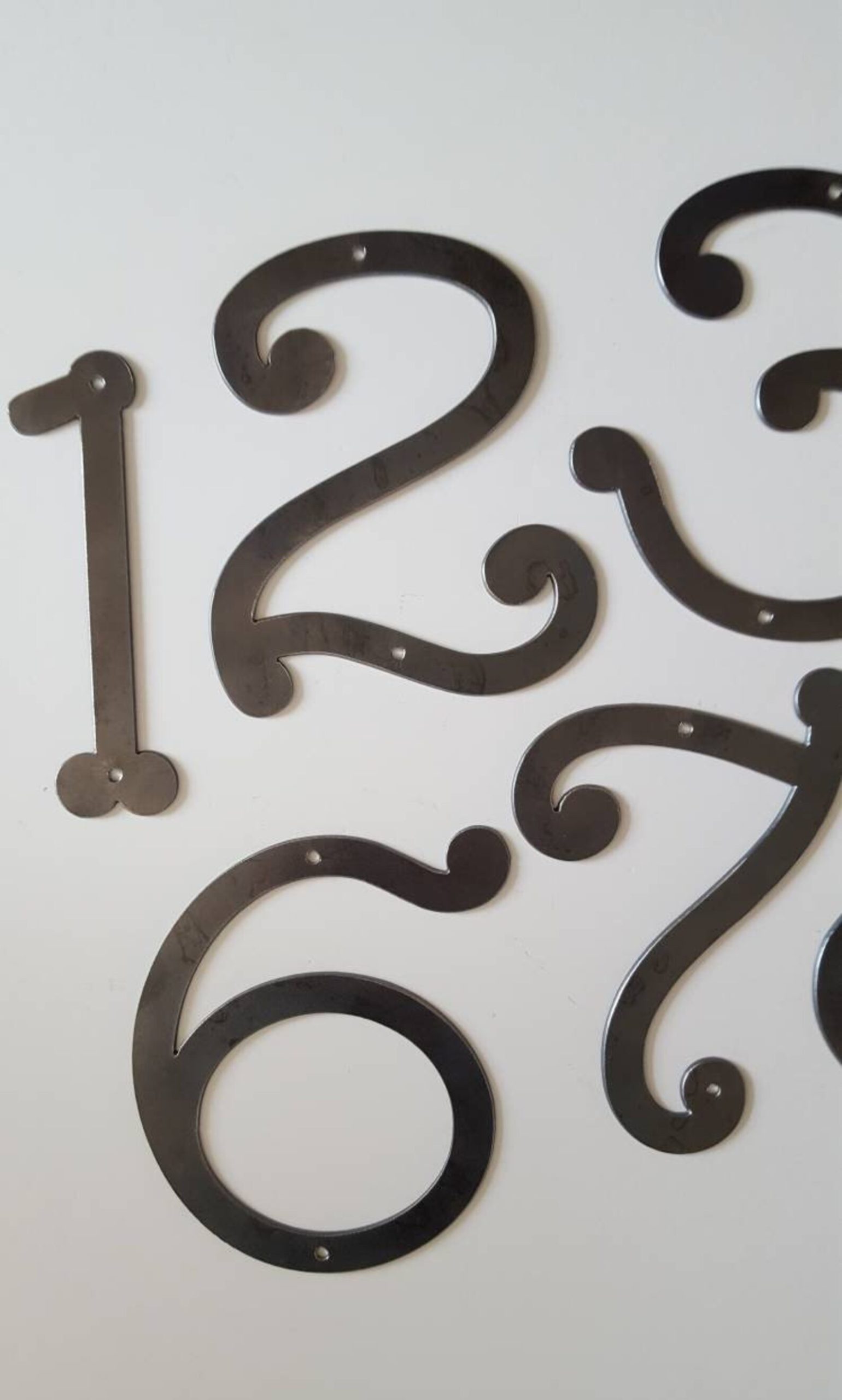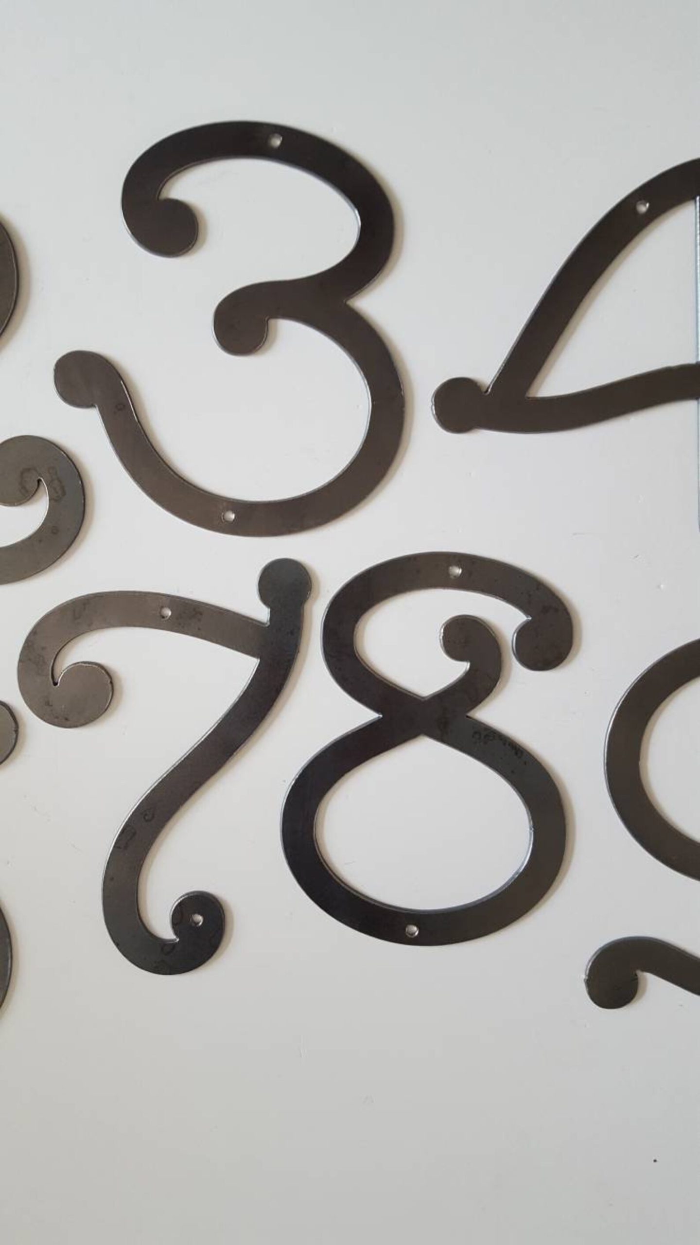 Large Metal House Numbers are approx. 8" high. Buy 1, 2, 3, 4 or 5 numbers. Choose unpainted or painted with flat black rustoleum paint. 14 Gauge metal. For Home or Office. Apartment or Room Numbers. Birthday, Christmas, or Housewarming gift. Holes drilled in them for hanging. When purchasing, please leave in the 9;notes9; which numbers you want.
