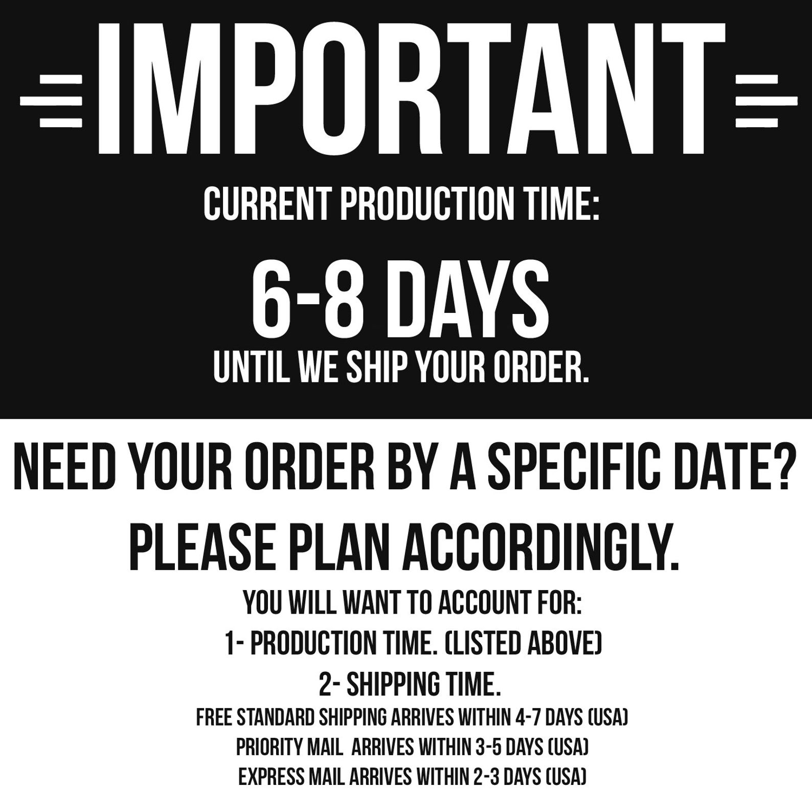 ? Our current production timeline is 7-10 business days from your order date until we ship. Whenever possible, we do try to ship sooner. Once your order has shipped our standard transit time takes approx. 3-7 business days to arrive. You may purchase priority mail shipping upgrade upon checkout to increase your shipping speed to 2-3 days. Note: These estimates are for U.S. based addresses.