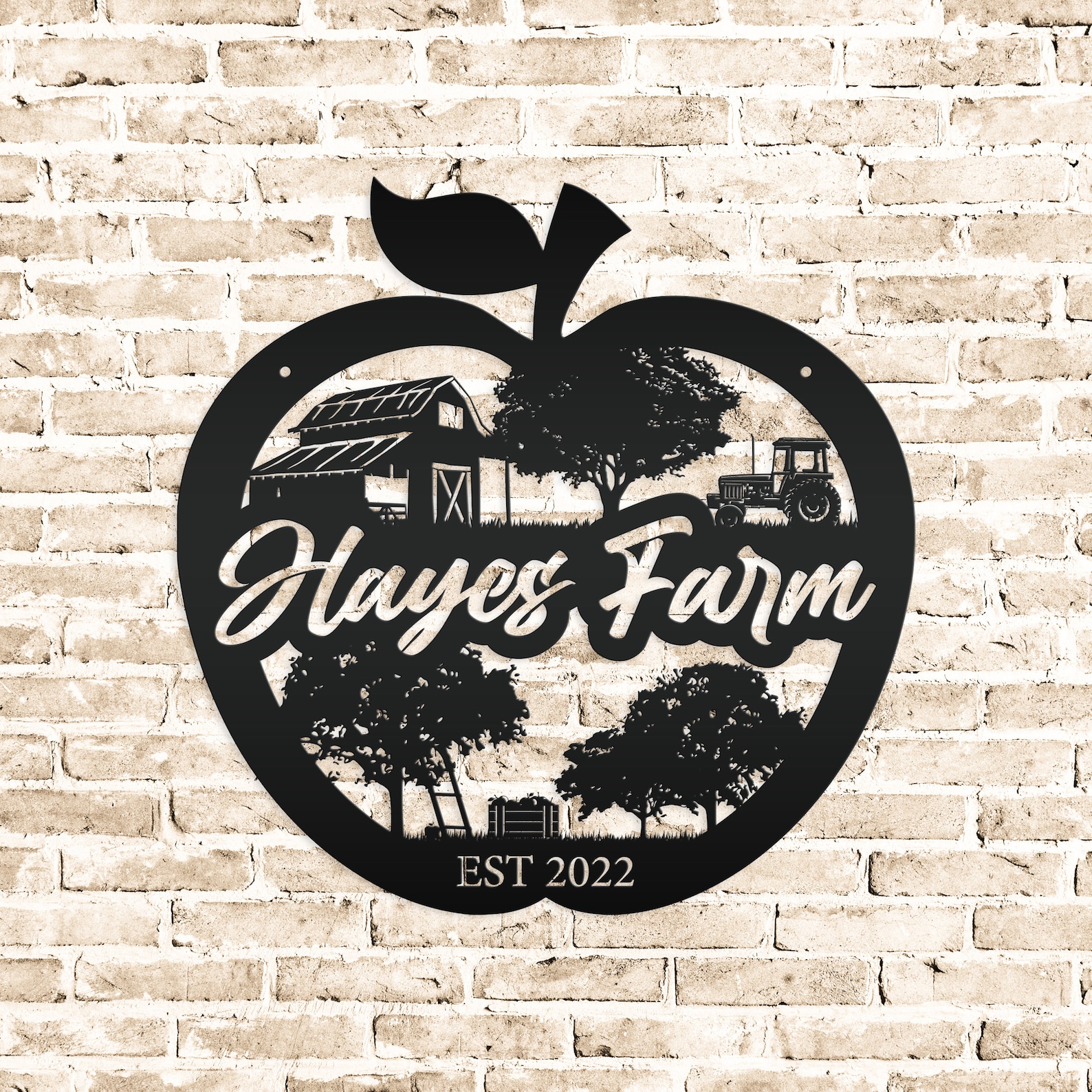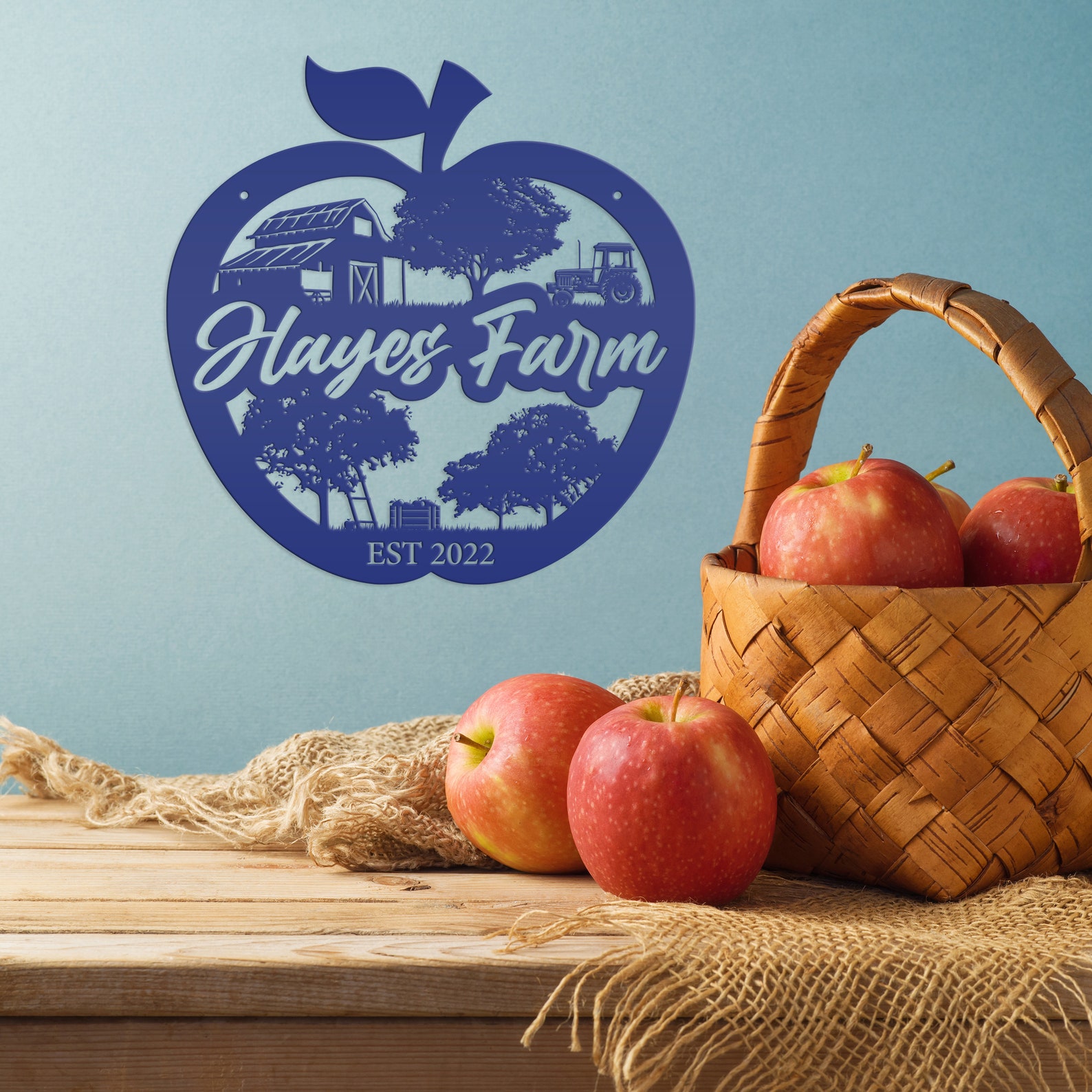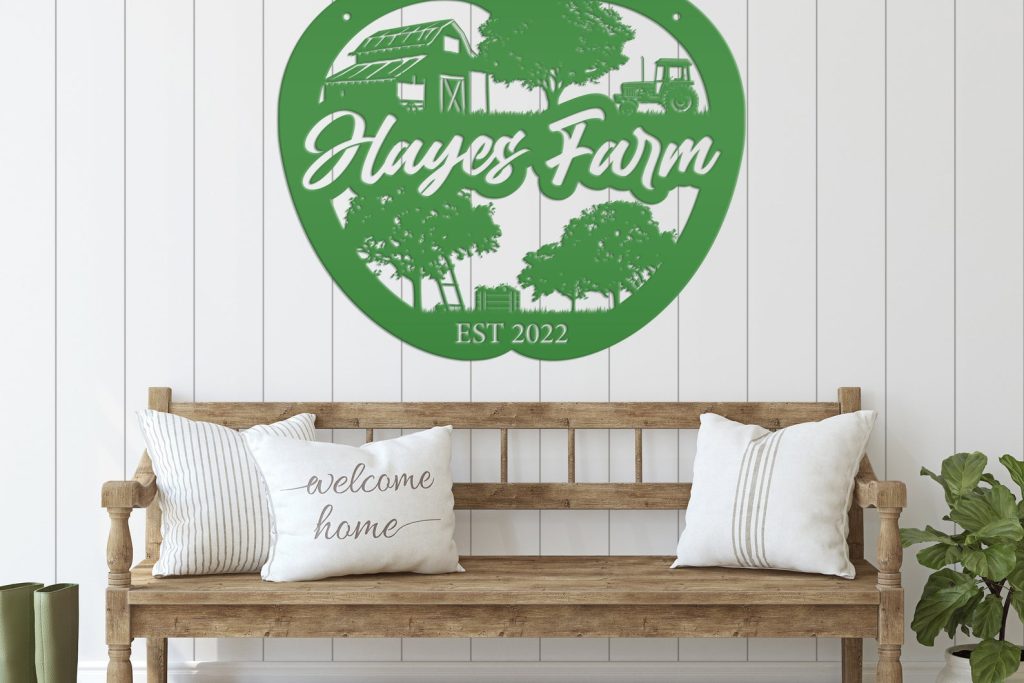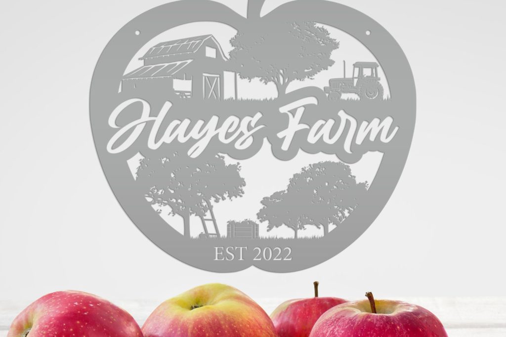 Add a touch of charm to your homestead with our Farm Sign Apple Orchard Sign. Crafted from durable metal, this indoor/outdoor wall signage is perfect for hanging outside your apple orchard or business. Make it personal with your family name for a unique and thoughtful gift idea. With its rustic appeal, this piece is bound to add a cozy touch to your home decor.