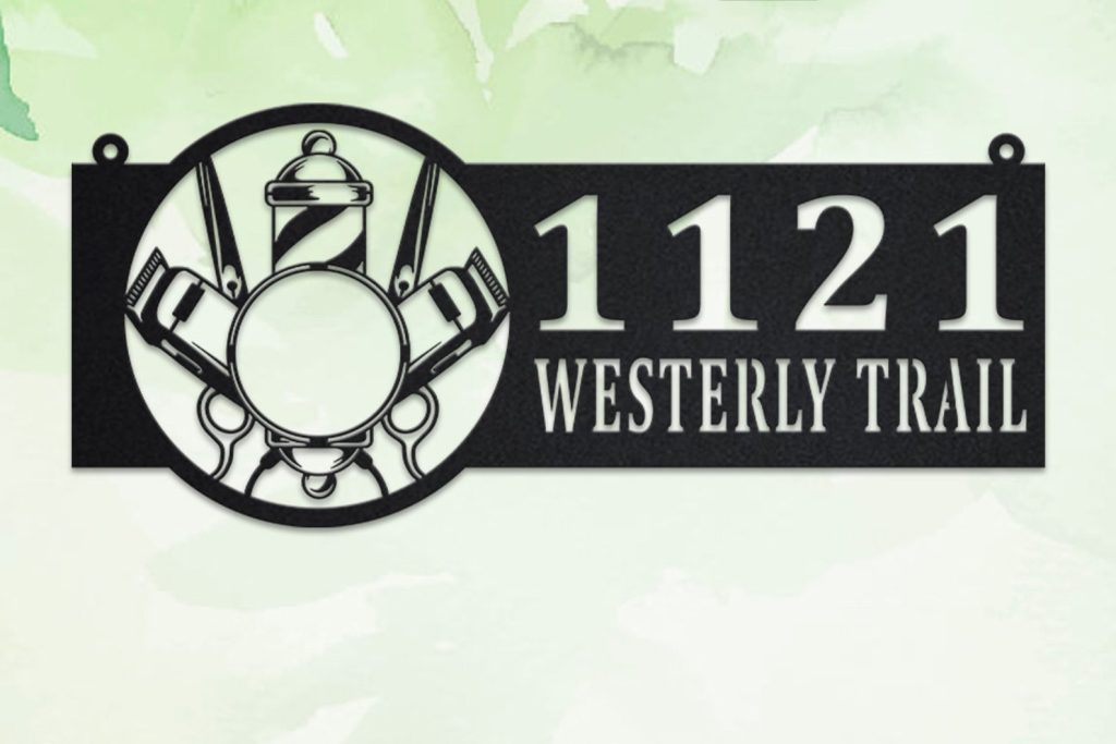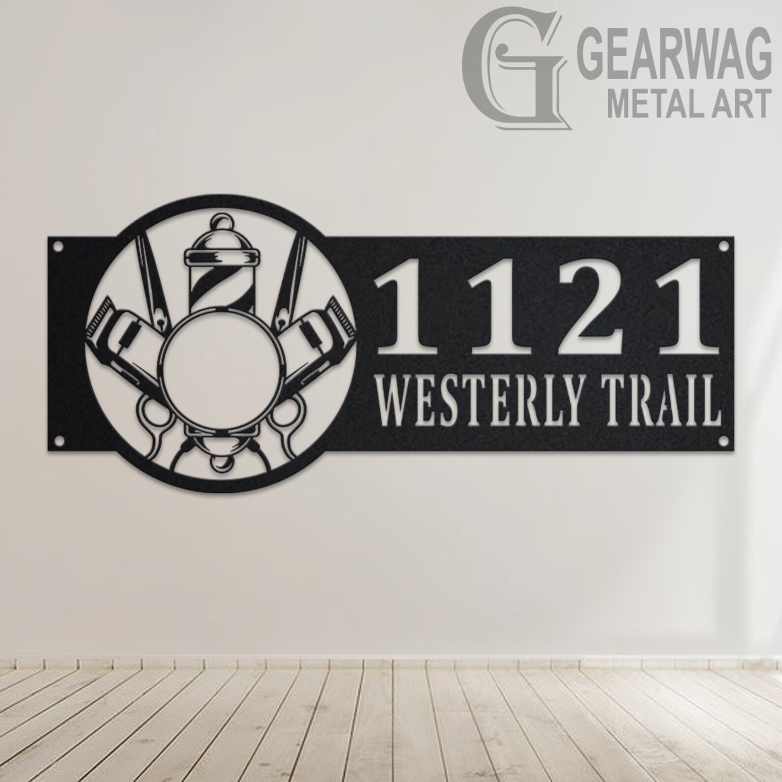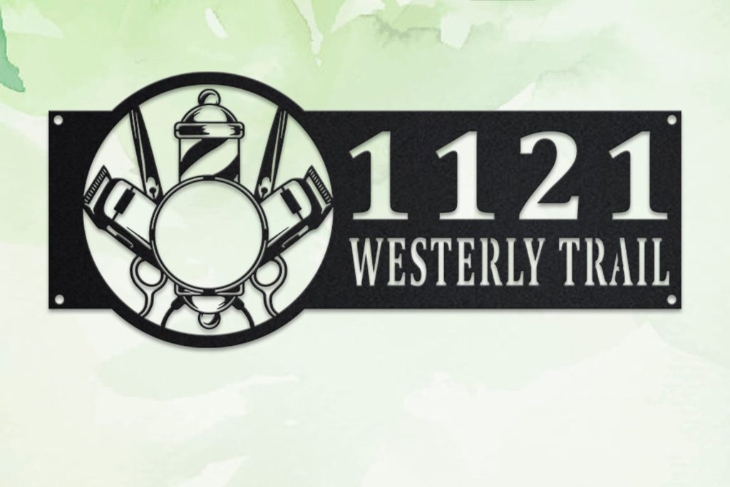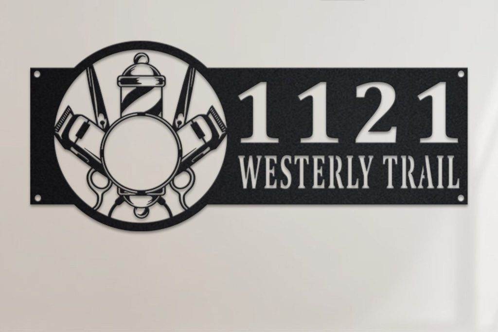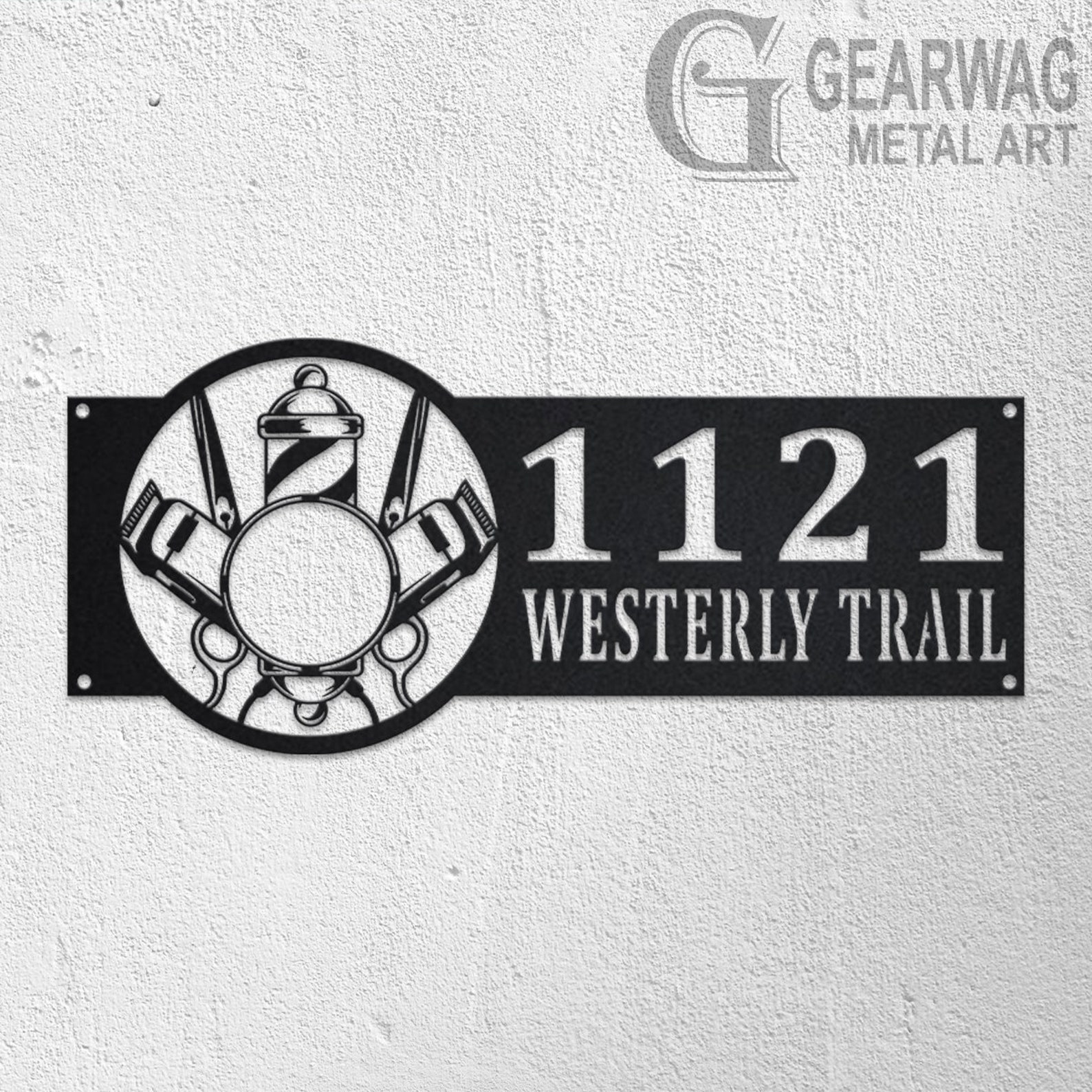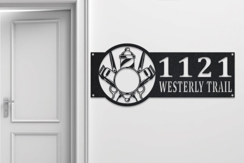 Barbershop Address Sign – Personalized Metal Shop Plaque