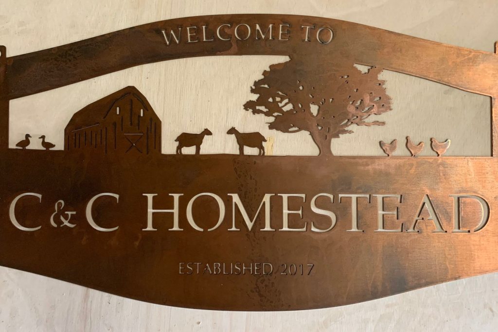 Rustic, personalized metal sign with barn and goat scene. Animals can be customized!