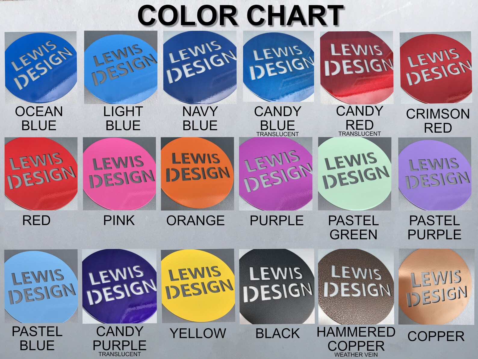 Candy colors and transparent colors are fully transparent. Any flaws that exist in the metal underneath the color will show through the color and be visible. This includes scratches, blemishes, cut marks, burns from the cutting process, etc.