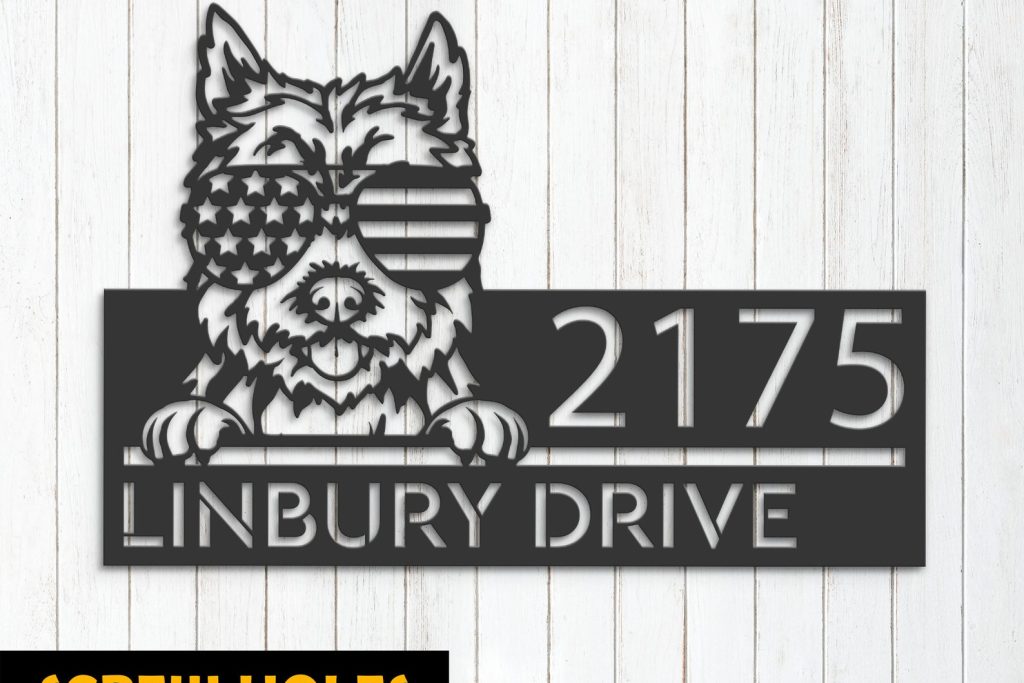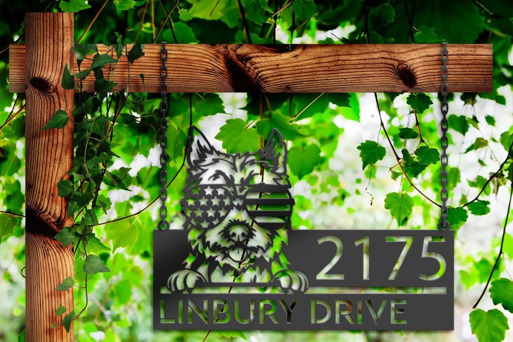 Be the first to review “Cairn Terrier with US Flag Glasses Metal Address Sign”