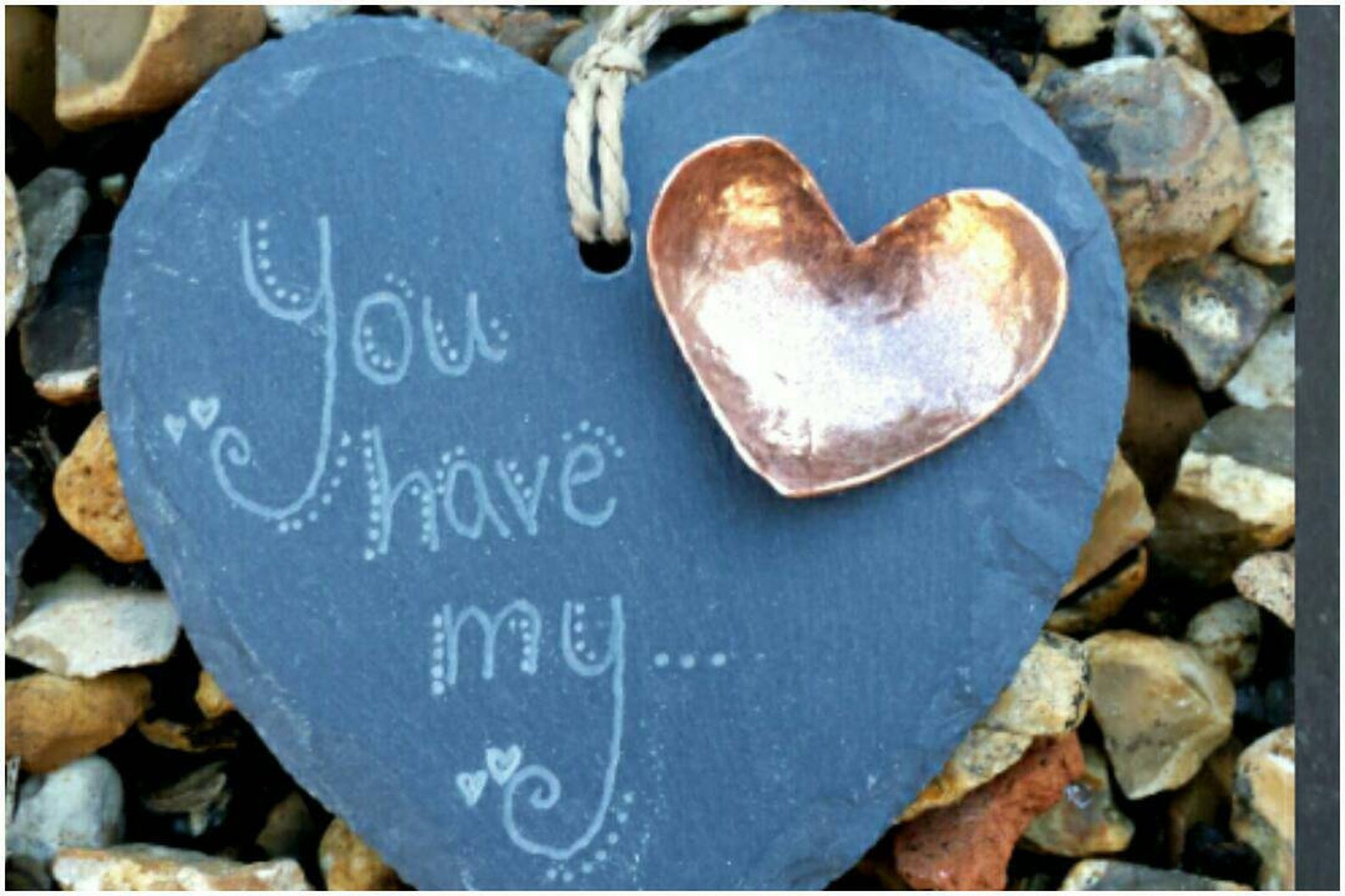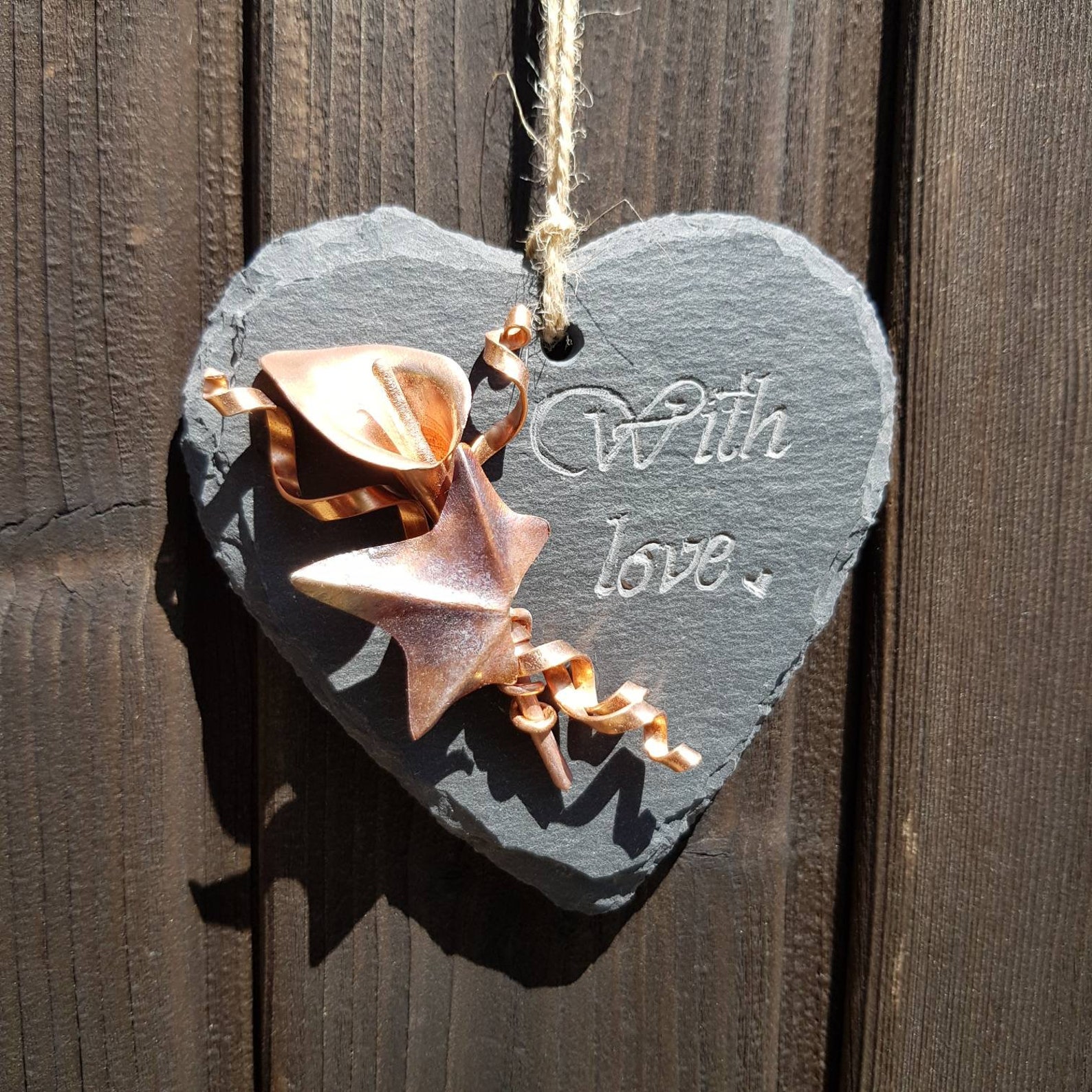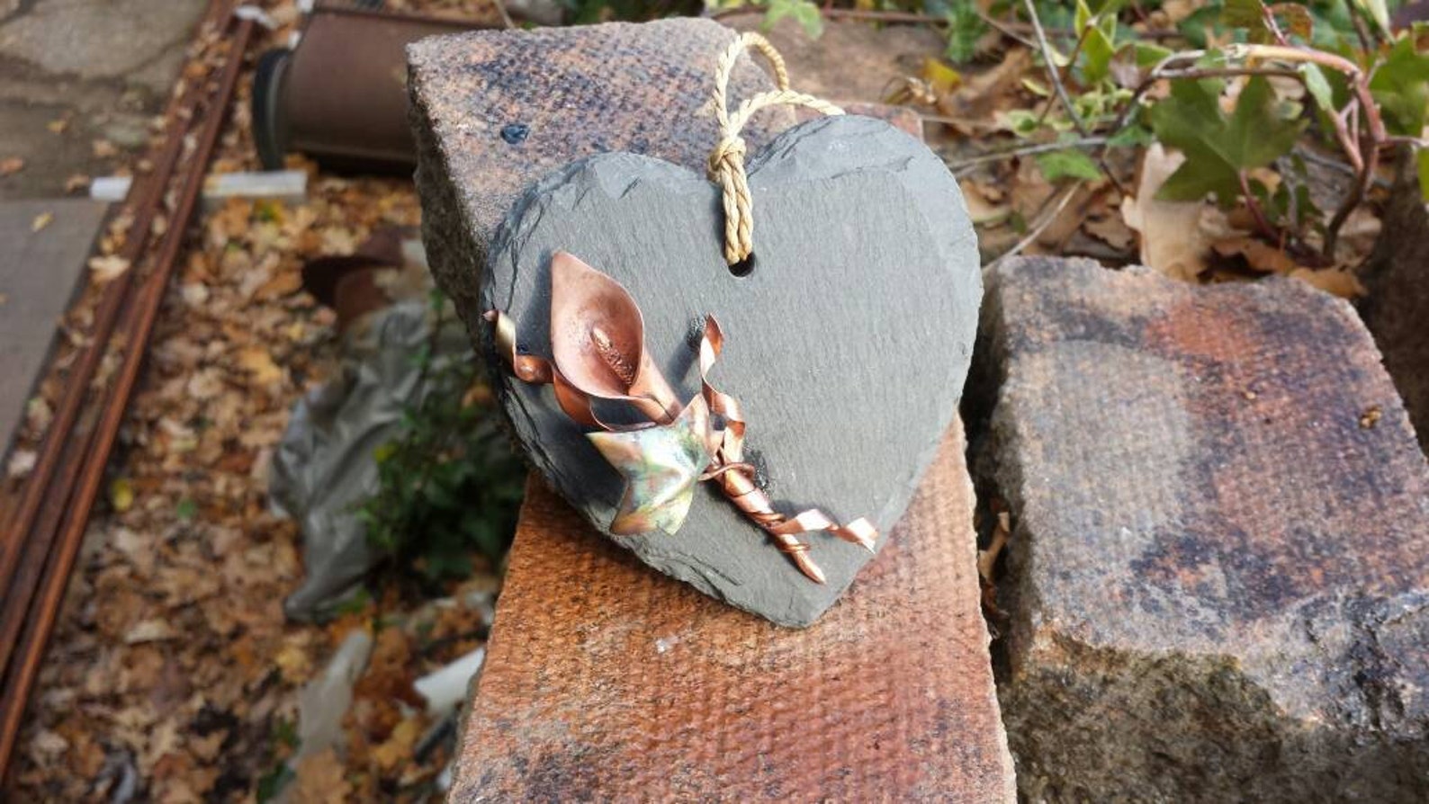10cm x 10cm slate heart with a copper calla lily and ivy spray attached.
