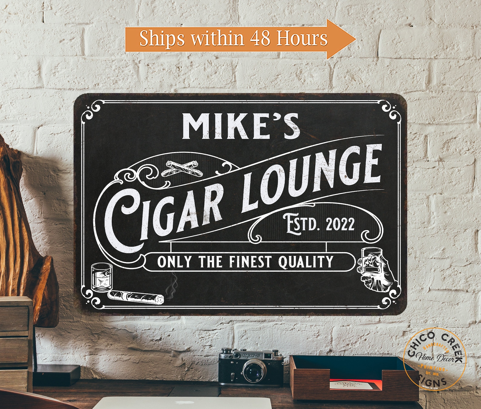We ship out all of our orders out within 48 hours!!! Each sign is designed and manufactured by us from our shop in Chico California. Get one of these beautiful custom signs to your door FAST, no more waiting weeks for your custom orders.