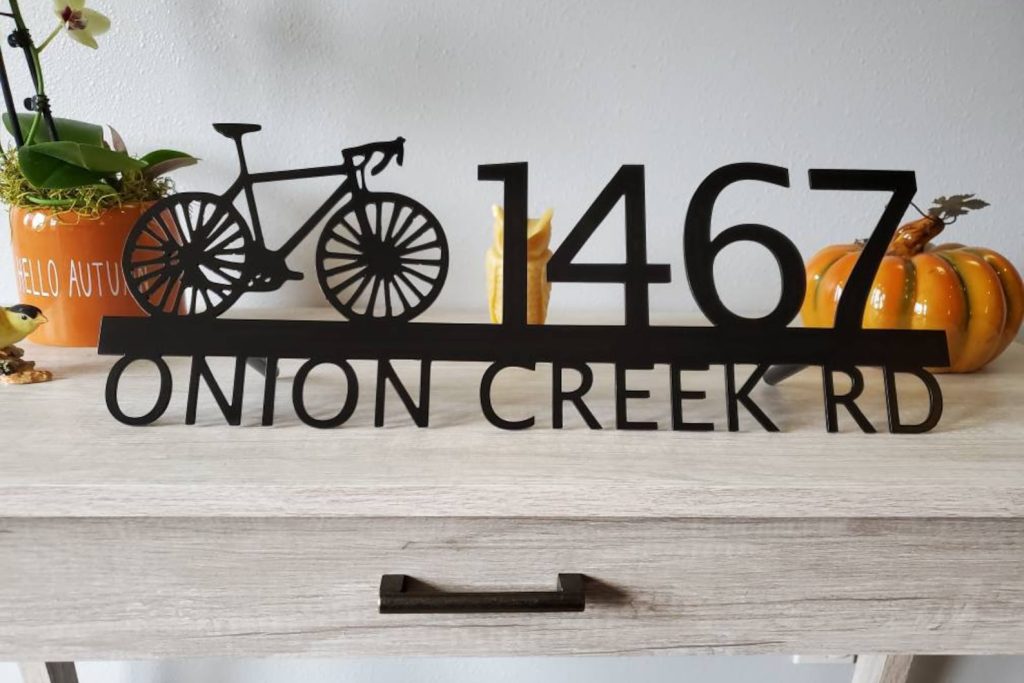 Custom metal personalized address sign/house numbers with bicycle bike for your rock or wall. Finished with highly durable exterior matte black powder coating. This address sign is made out of highly quality durable/sturdy 1/8 inch thick steel(12gauge). This gives the item a very sturdy feel. Item comes as shown in listing photos numbers are offset to the right. We will send you a mock-up of the design. Size is 8 but the height does vary slightly depending on text length.