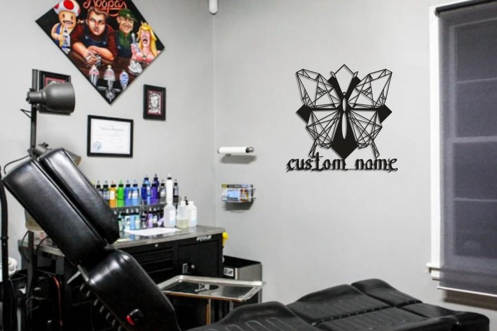 Custom Butterfly Tattoo Metal Wall Art, Tattoo Wall Art, Tattoo Studio Decor, Personalized Monogram Sign, Tattoo Studio Sign, Office Decor