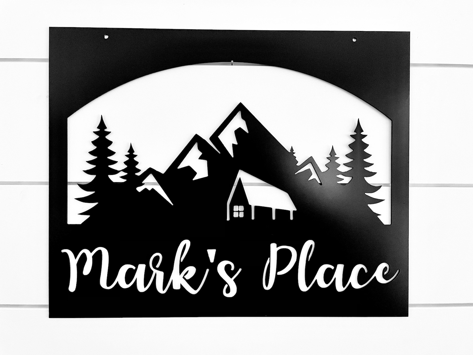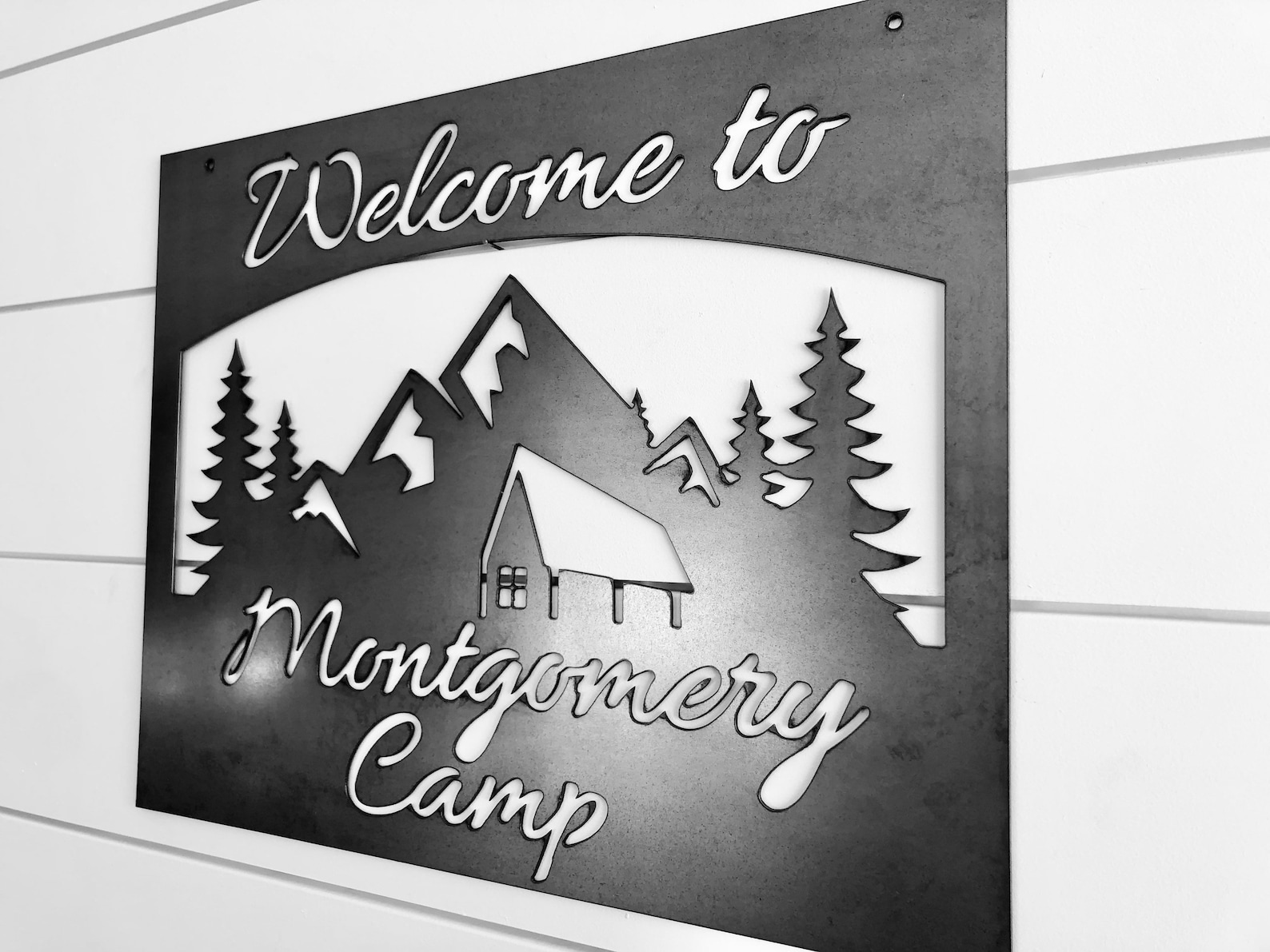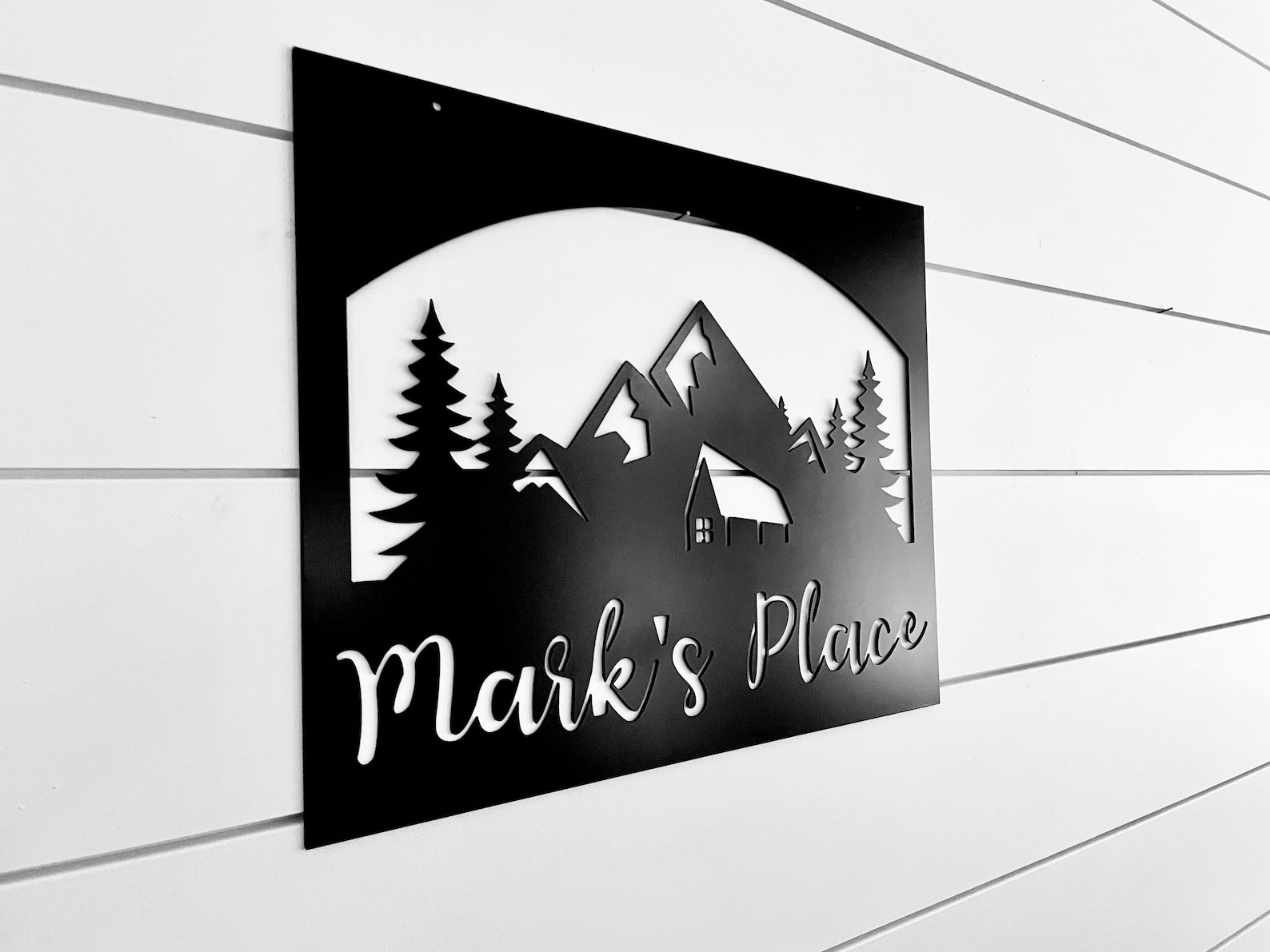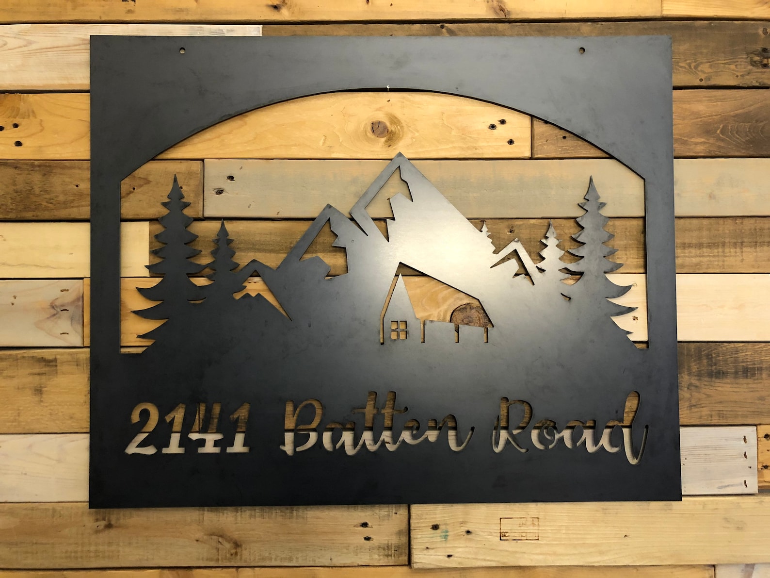 This listing is for one custom mountain scenery with cabin sign handmade from high quality durable 14 gauge steel and comes in our raw metal or painted black finish. Note: Sign is made from unfinished steel which will patina over time in wet conditions or stored outside. Custom color powder coating is available upon special request for an additional fee.