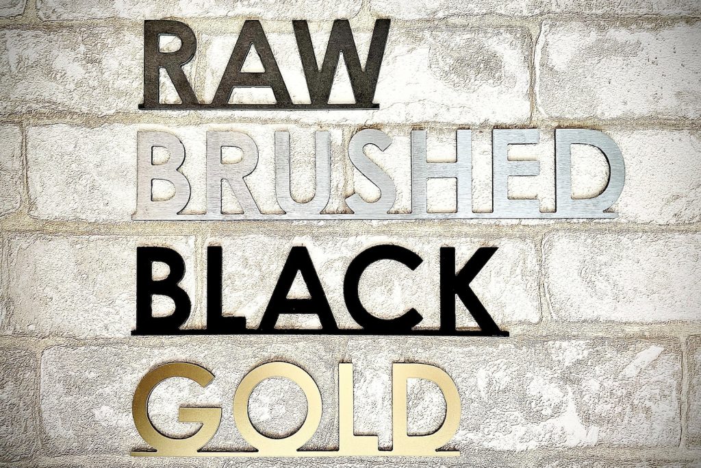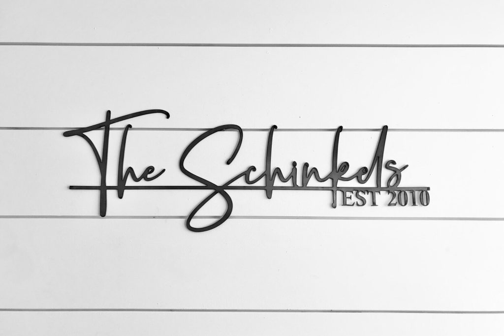 This listing is for one custom name sign (including est. date) in the script font shown, made from high quality durable 14 gauge steel and is available in 4 finishes: Raw metal, semi- brushed metal, painted black or gold.