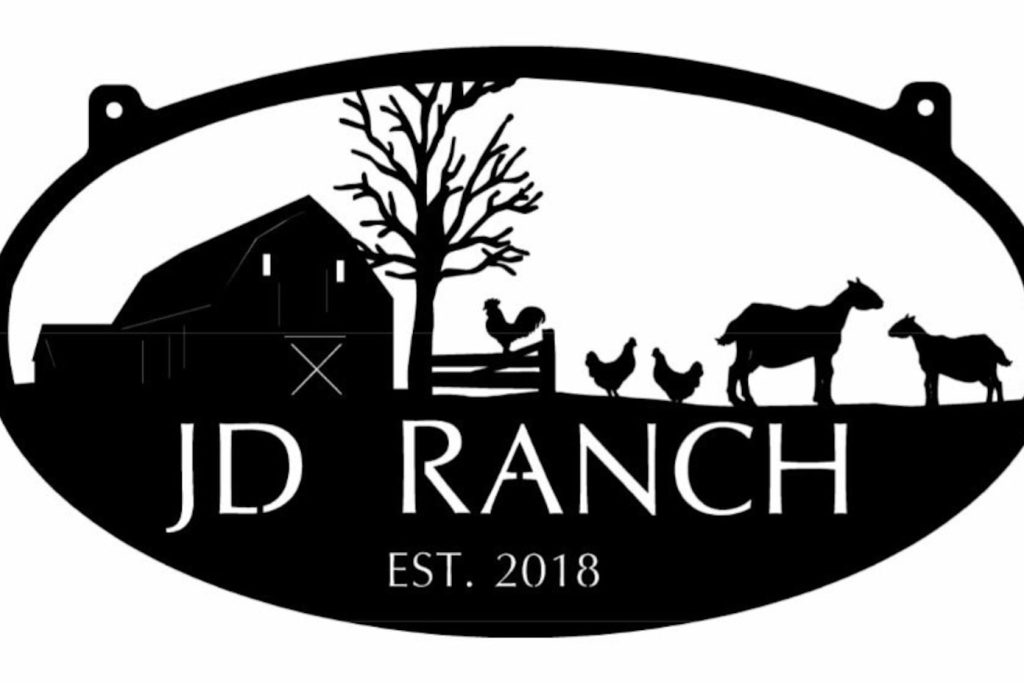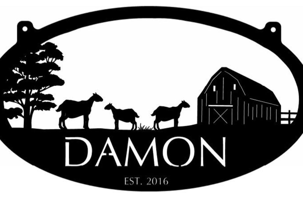 Rustic, personalized metal sign with barn and goat scene. Measures 28" x 16". Powder coated black or beautiful rustic acid finish and clear coated . Makes a very attractive entrance sign.Incl with the price is customizing with your name.Our finish is a baked on powder coat for a very long lasting durable finish.