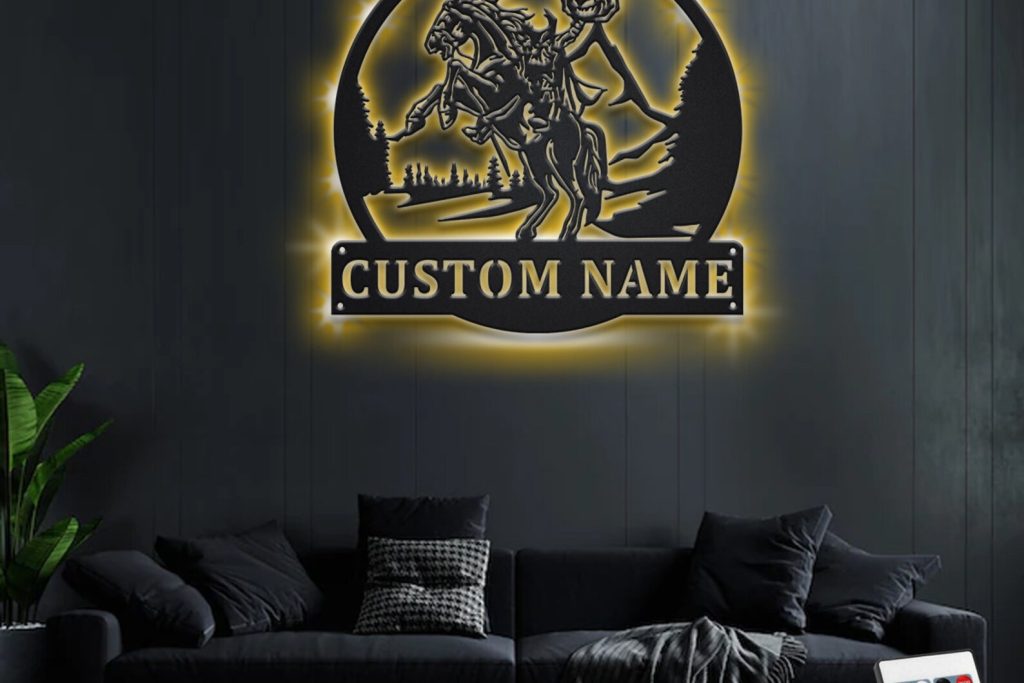 Custom Headless Horseman Metal Wall Art with LED Light, Personalized Name Sign