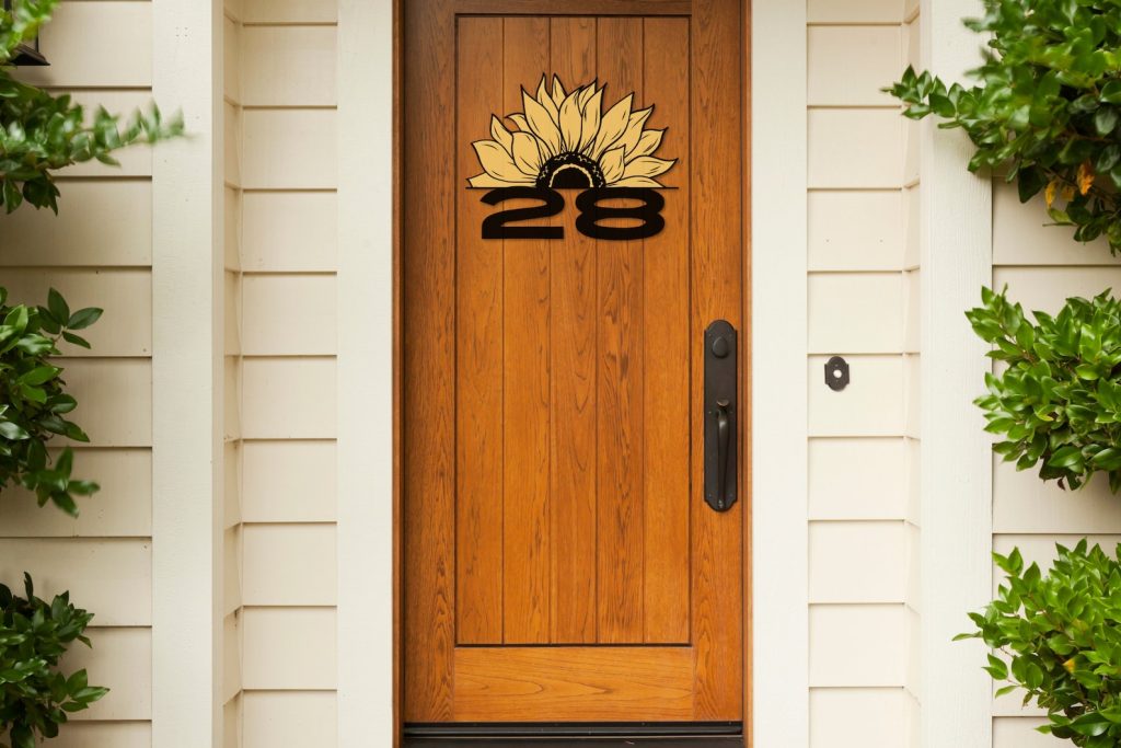 Personalization Options: Make this sign uniquely yours by choosing your preferred names, text, and house numbers. Customize the placement of the split sunflower design to suit your style.