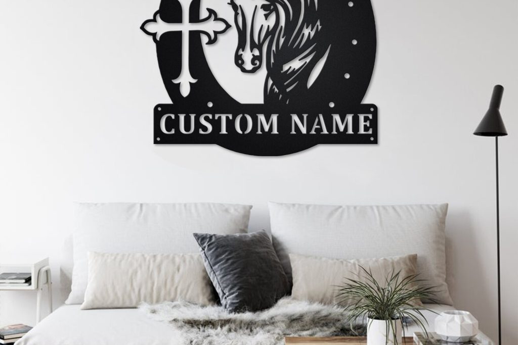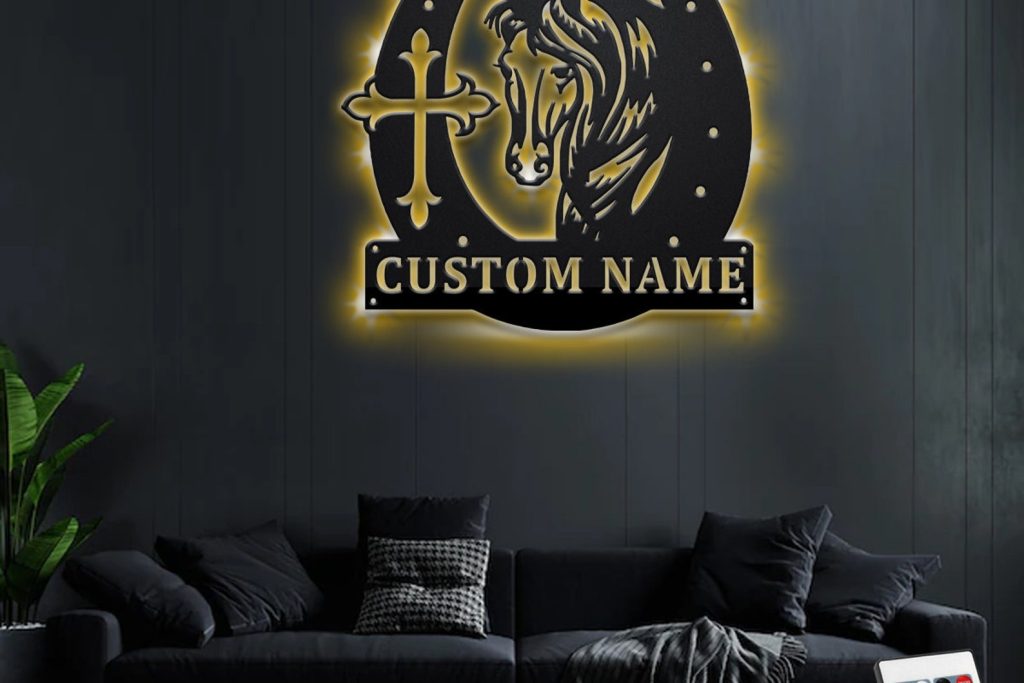 Custom Large Horseshoe Metal Sign with LED – Horse & Cross