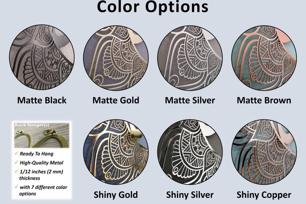 We have Matte Black, Matte Gold, Matte Silver, Matte Brown, Matte Red, Matte White or Shiny Gold, Shiny Silver, Shiny Copper options.