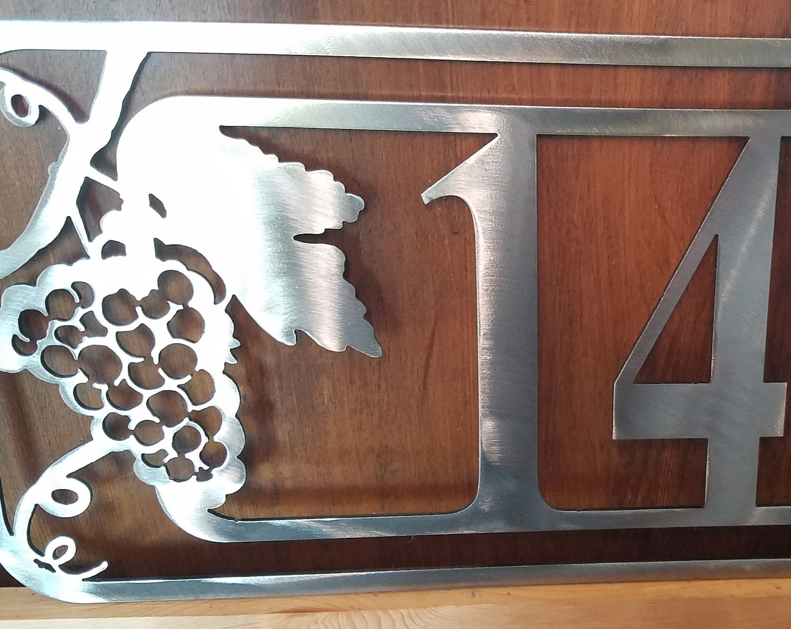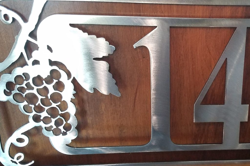 Custom designed grape vine inspired metal address plate. Plasma cut from 16 gauge cold rolled steel and added holes for mounting on house or fence, screws not incl. Choose from heat blued with clear coat, shined metal with clear coat, white, black, bronze. All items are powder coated giving them lasting uv protection and durability.