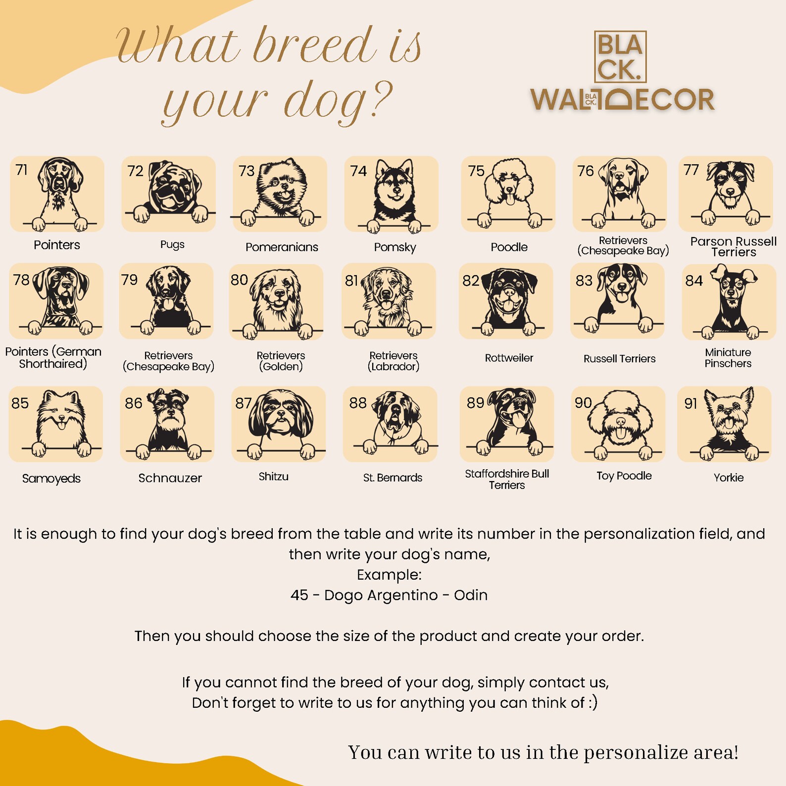 After finding the breed of your own dog among 90 breeds, you need to write the breed number and breed name in the personalization field,