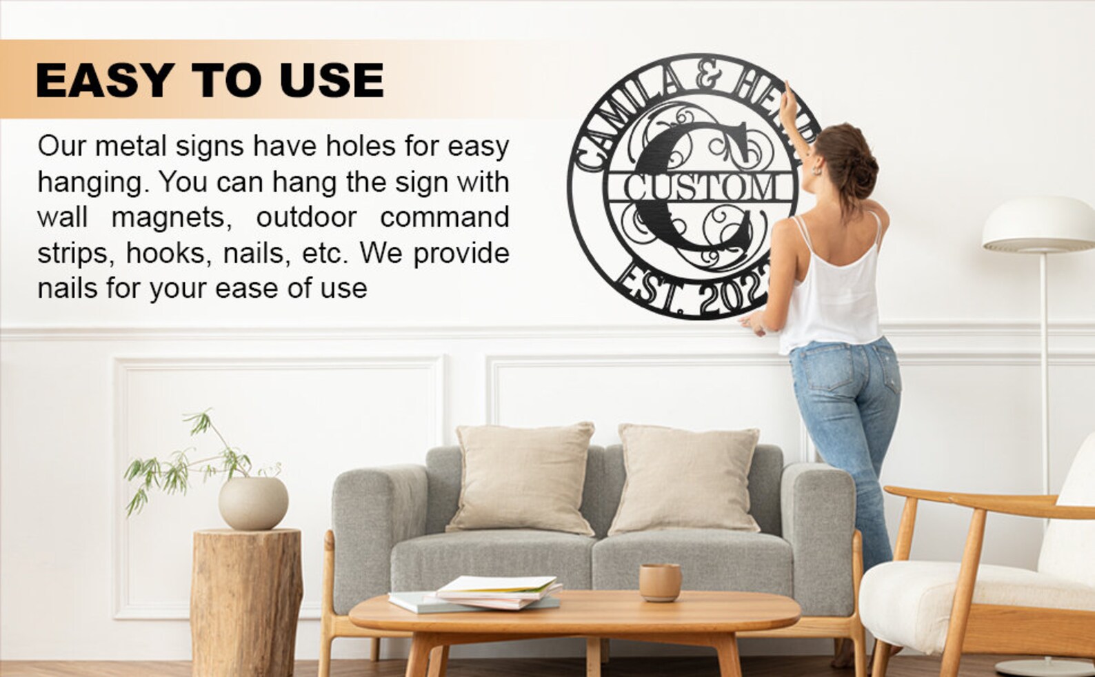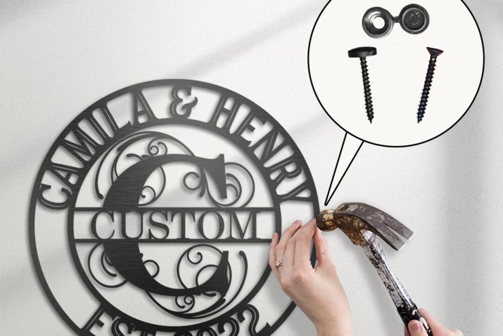 asy to hang — You will receive a name sign with nails and screws. There are holes for you to hang metal signs. You just need to find a suitable place and position it with a hammer. The design of two or more holes can make the name sign more stable, dont worry about it falling or something. The nut can hide the screw without affecting its beauty.