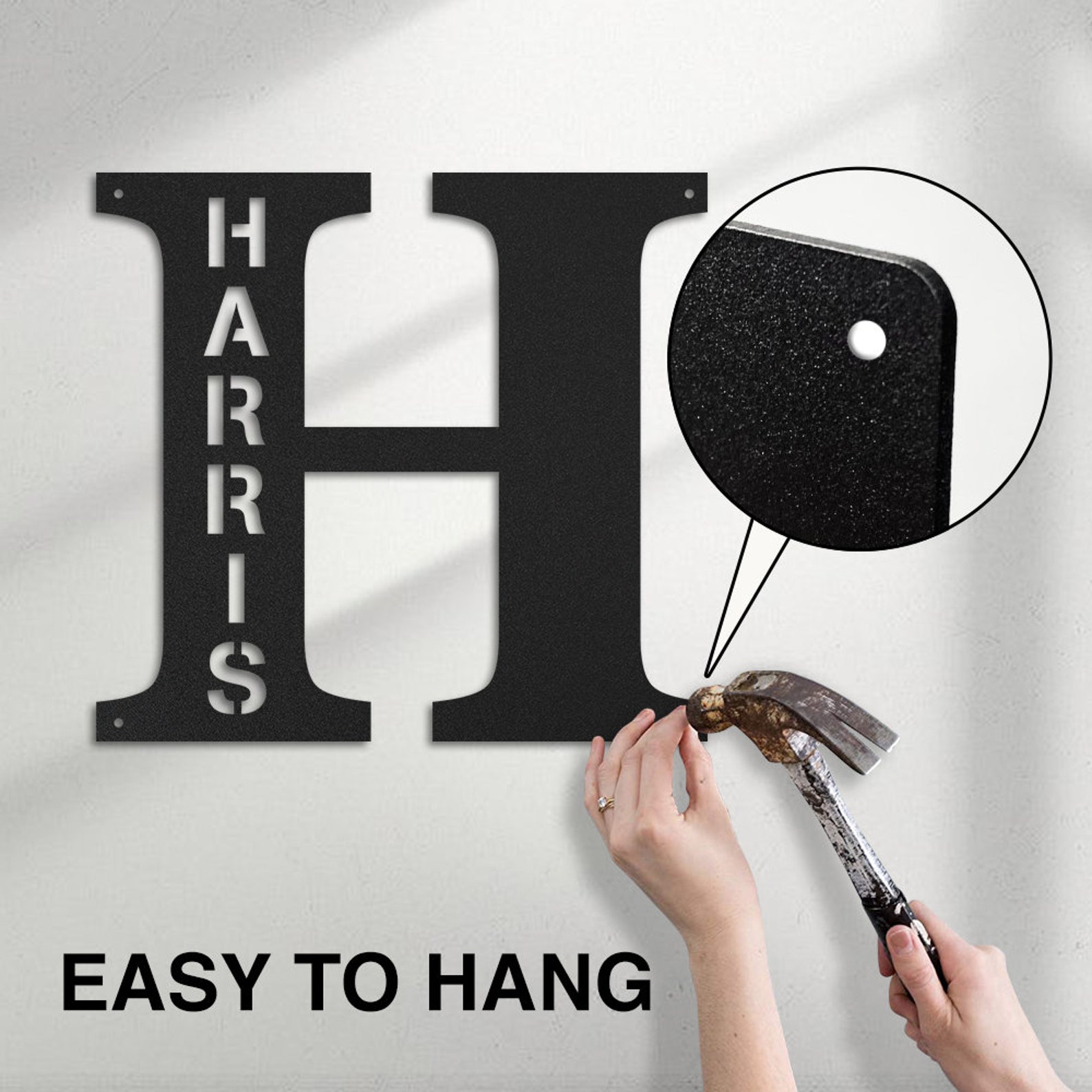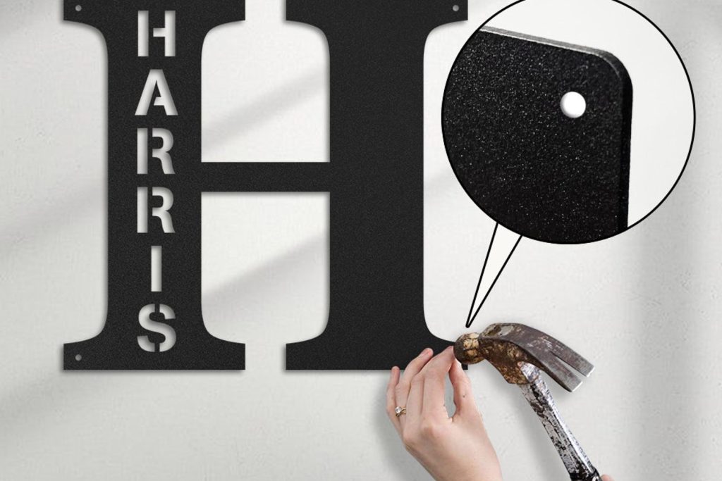 asy to hang — There are holes for you to hang metal signs. You just need to find a suitable place and position it with a hammer. The design of two or more holes can make the name sign more stable, dont worry about it falling or something. The nut can hide the screw without affecting its beauty.