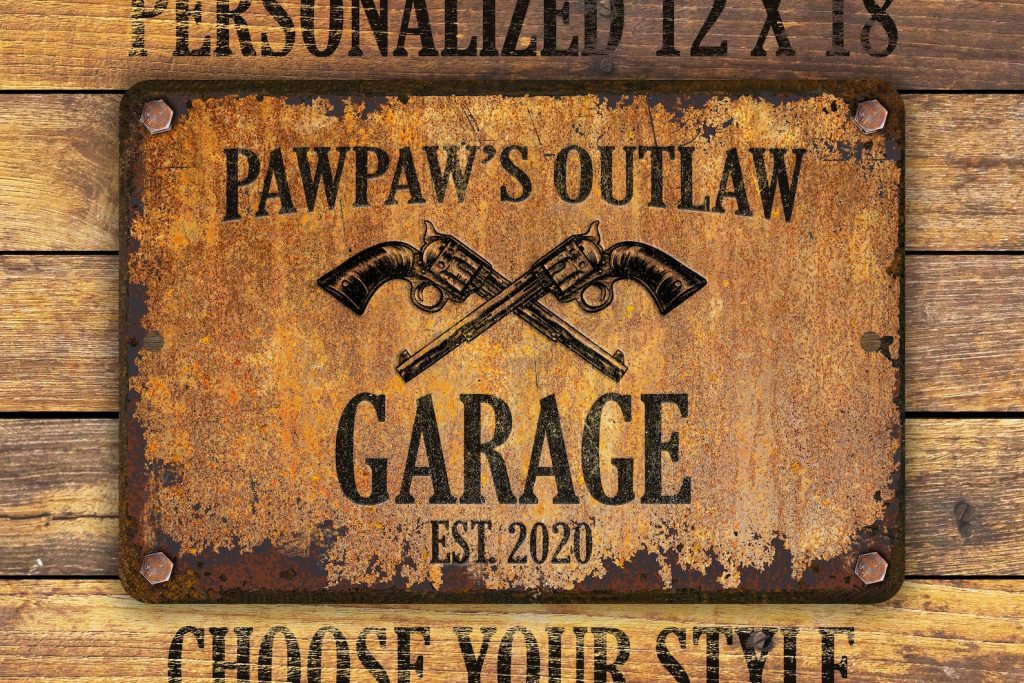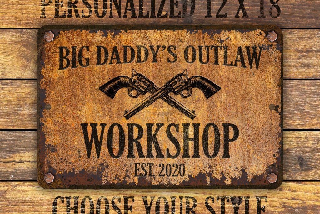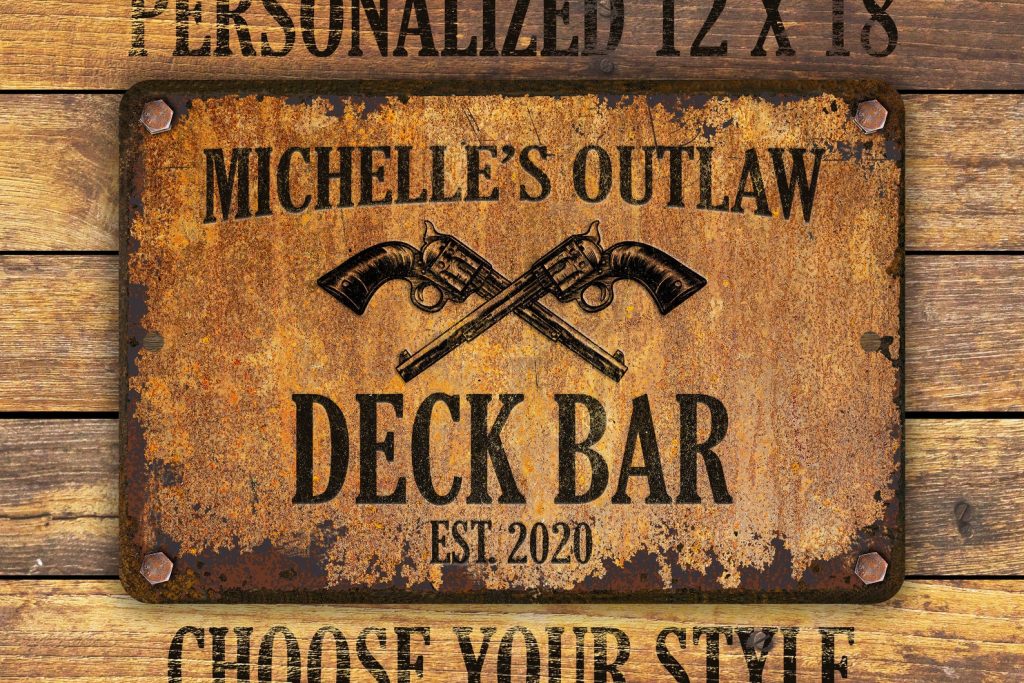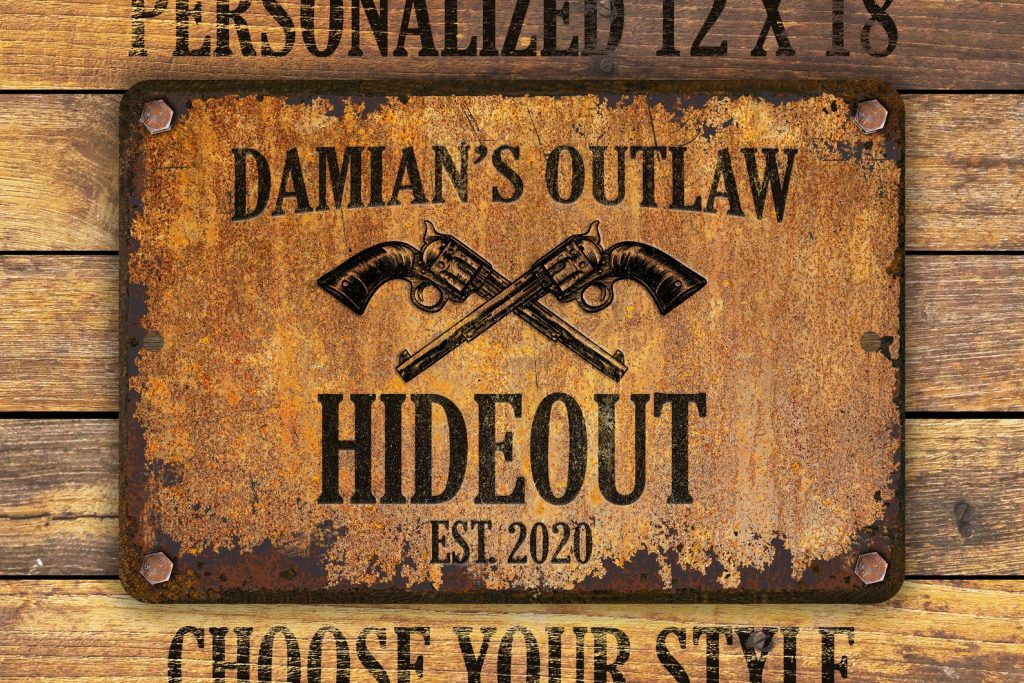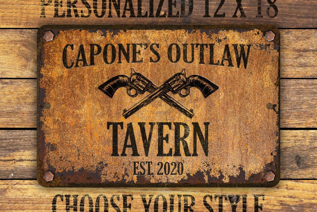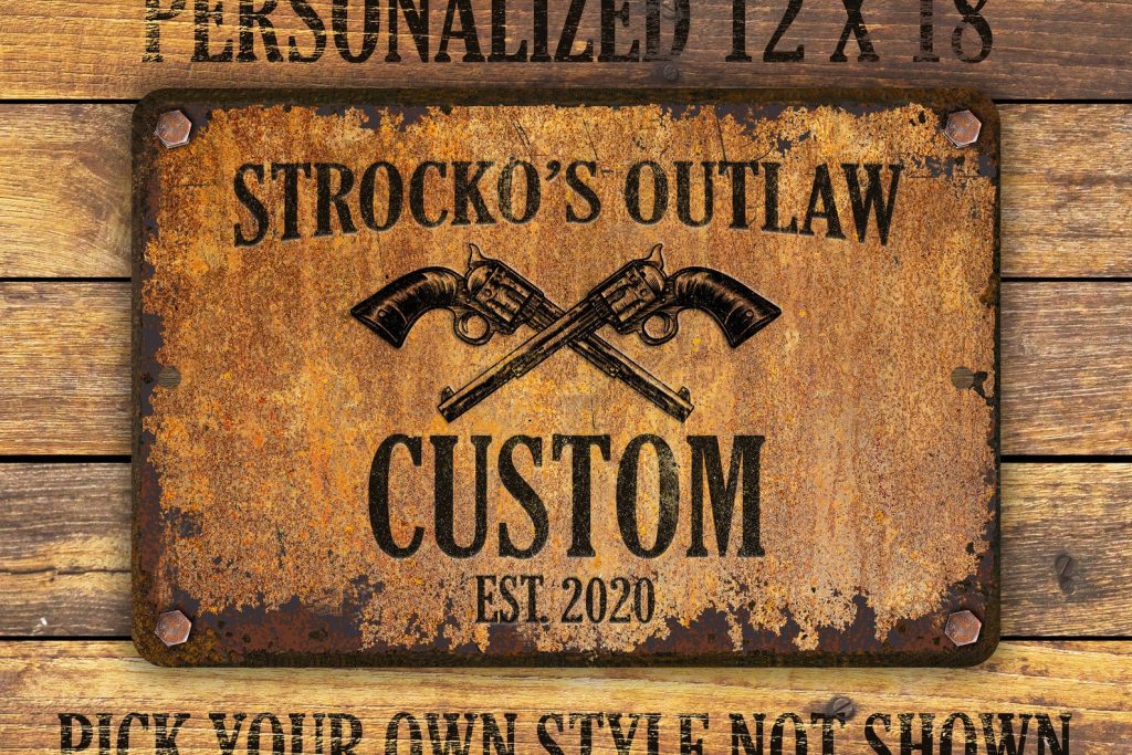 Custom rusty appearance outlaw-themed metal sign | Perfect gift for anyone who needs their own special sign with vintage appeal | Customize this sign with first name, family name, bar or shop name | Includes plenty of options to tailor the sign to commemorate your special place.