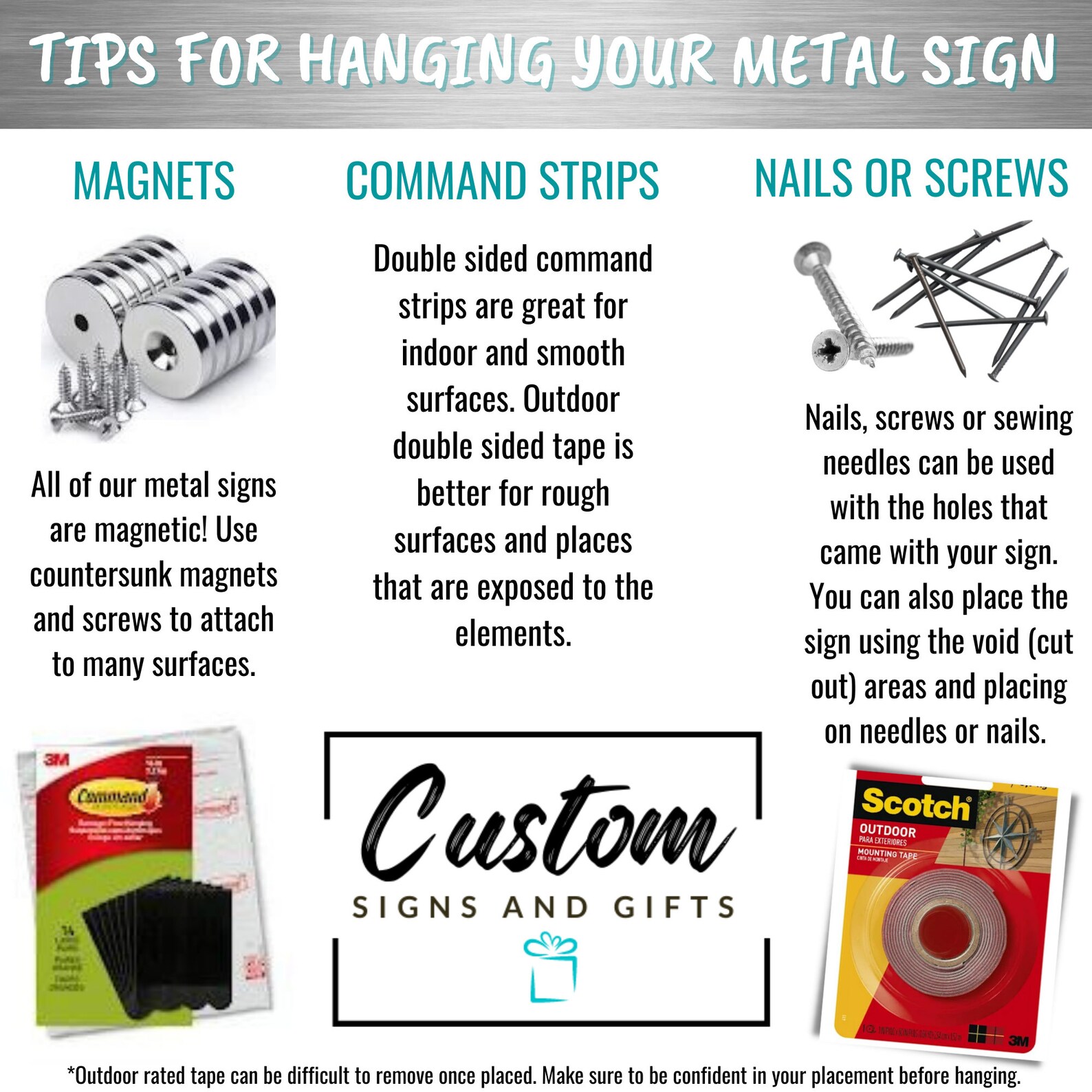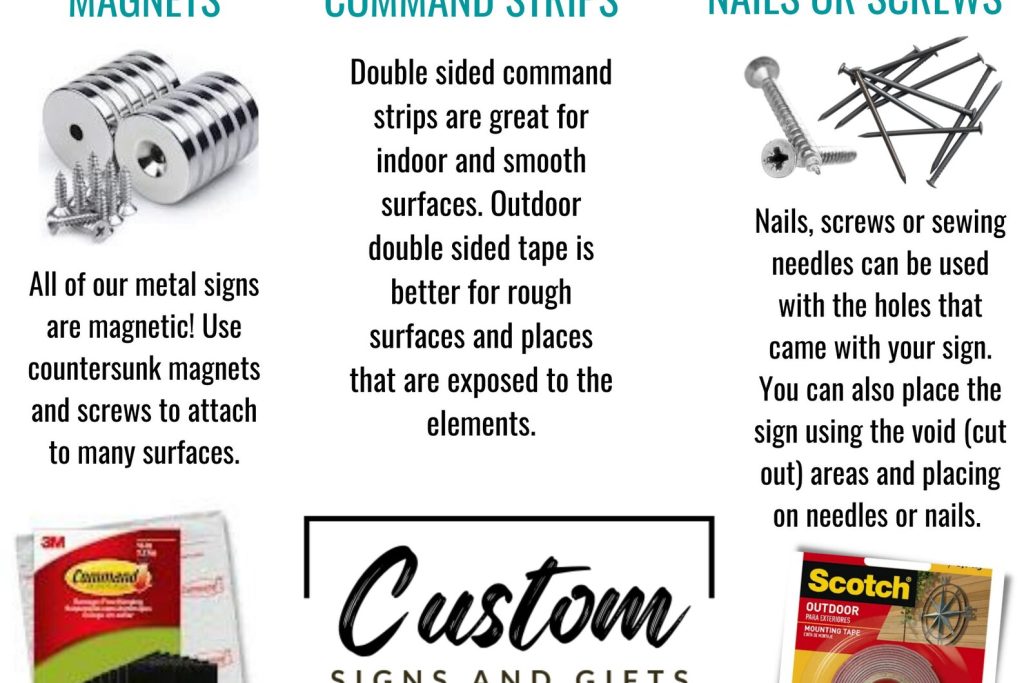 Our signs will also stick to magnets! Use counter sunk hole magnets with screws to attach.