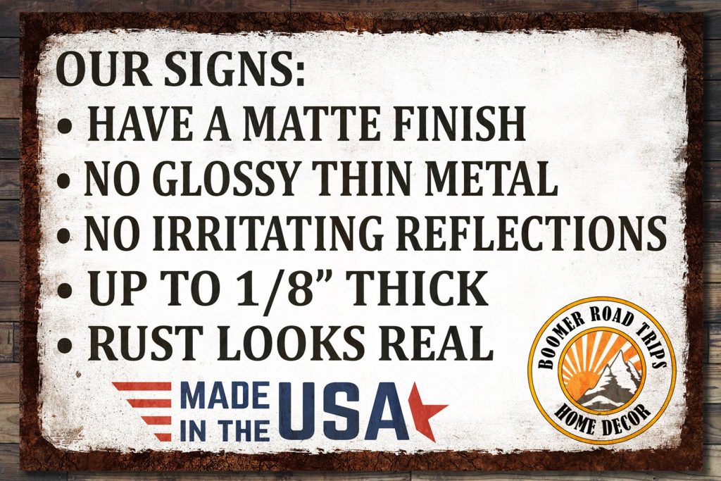 *** THIS IS A METAL SIGN WITH A MATTE FINISH *** NO GLARE or BLINDING GLOSSY REFLECTIONS *** It9;s not a glossy piece of thin metal like dye sublimation signs. This has a matte finish that looks much more realistic than gloss. Our premium signs are printed on 1/8" thick exterior grade aluminum composite sign material that gives a nice lightweight but rigid sign that looks much more realistic than shiny thin glossy signs. The simulated rust, weathering, or wood grain are in the image printed on the metal and when printed with a matte finish, look very realistic. The sign is flat and smooth with no texture or embossing.
