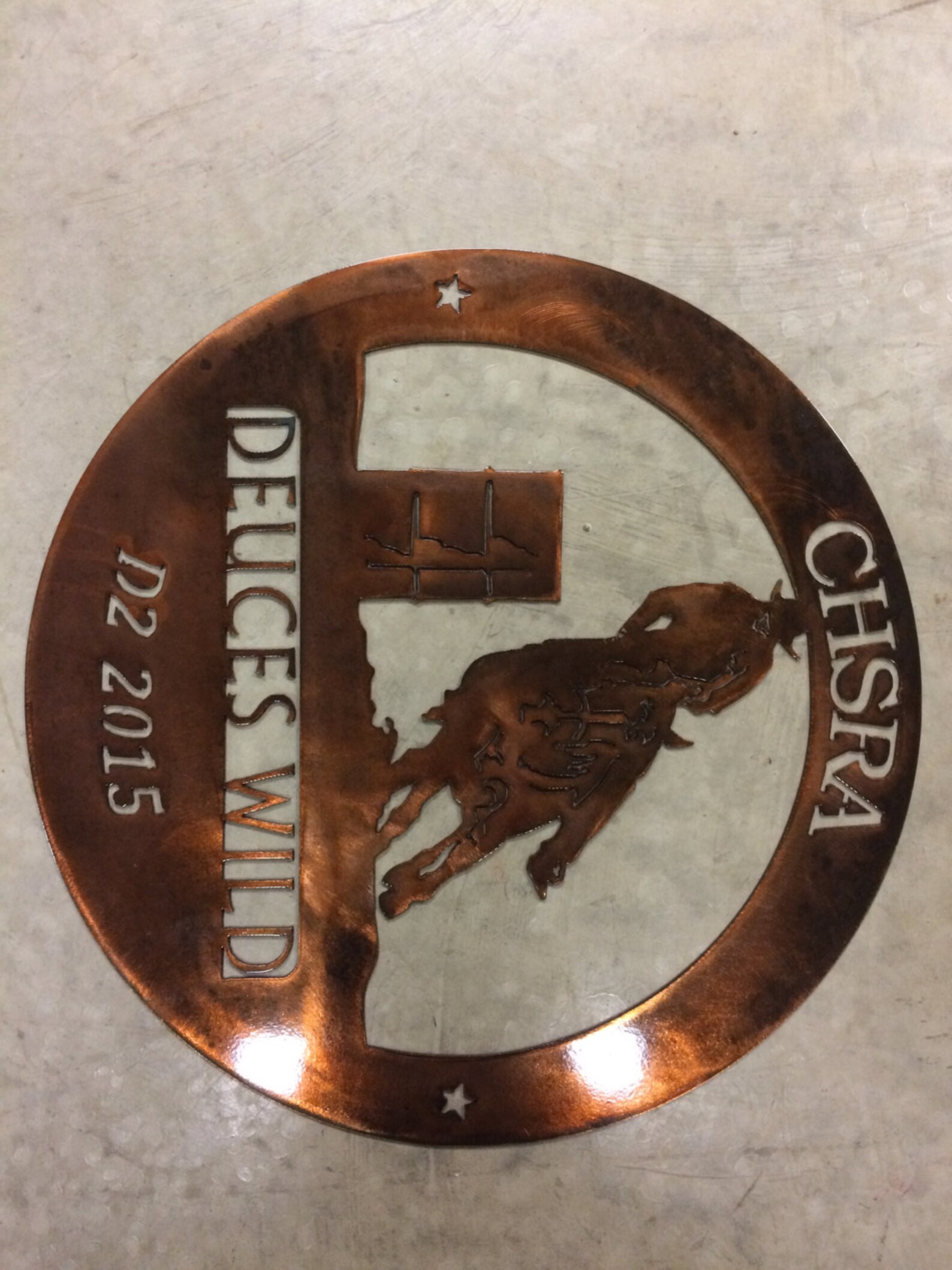 rodeo scene sign in gorgeous copper acid wash and baked on clear coat or solid baked on powder coat finish in black or silver.