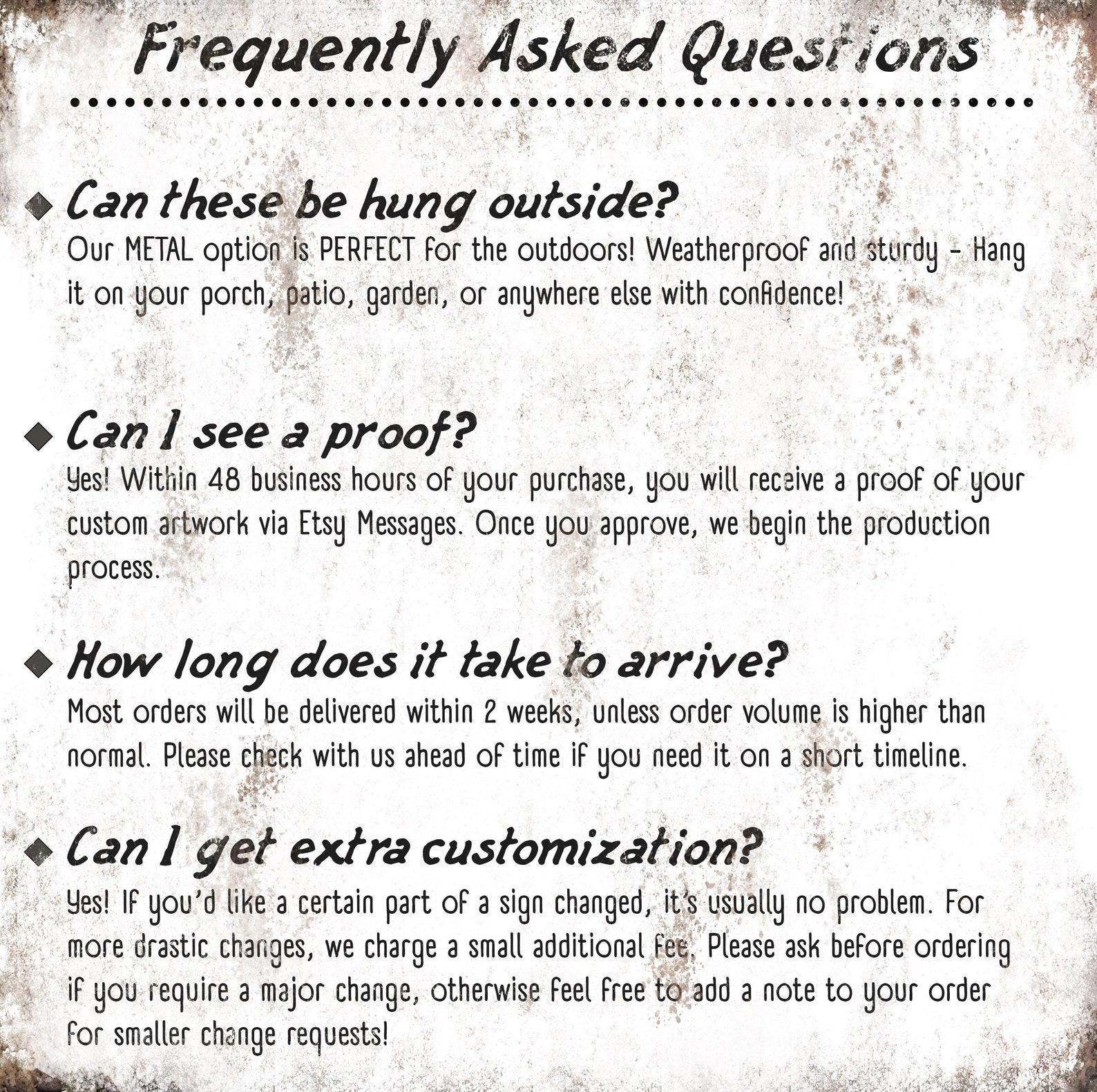 *** PLEASE KEEP AN EYE ON YOUR MESSAGES FOR ARTWORK PROOF IF ORDERING CUSTOM SIGNS — TO KEEP OURSELVES ALIGNED WITH SHIPPING TIMEFRAMES, WE SUBMIT ALL ORDERS TO OUR PRINTERS WITHIN 3 DAYS OF LAST EXPECTED SHIP DATE IF WE DON9;T RECEIVE RESPONSE FROM YOU —- QUICKER ARTWORK APPROVAL MEANS YOU RECEIVE YOUR ORDER FASTER — THANKS! ***