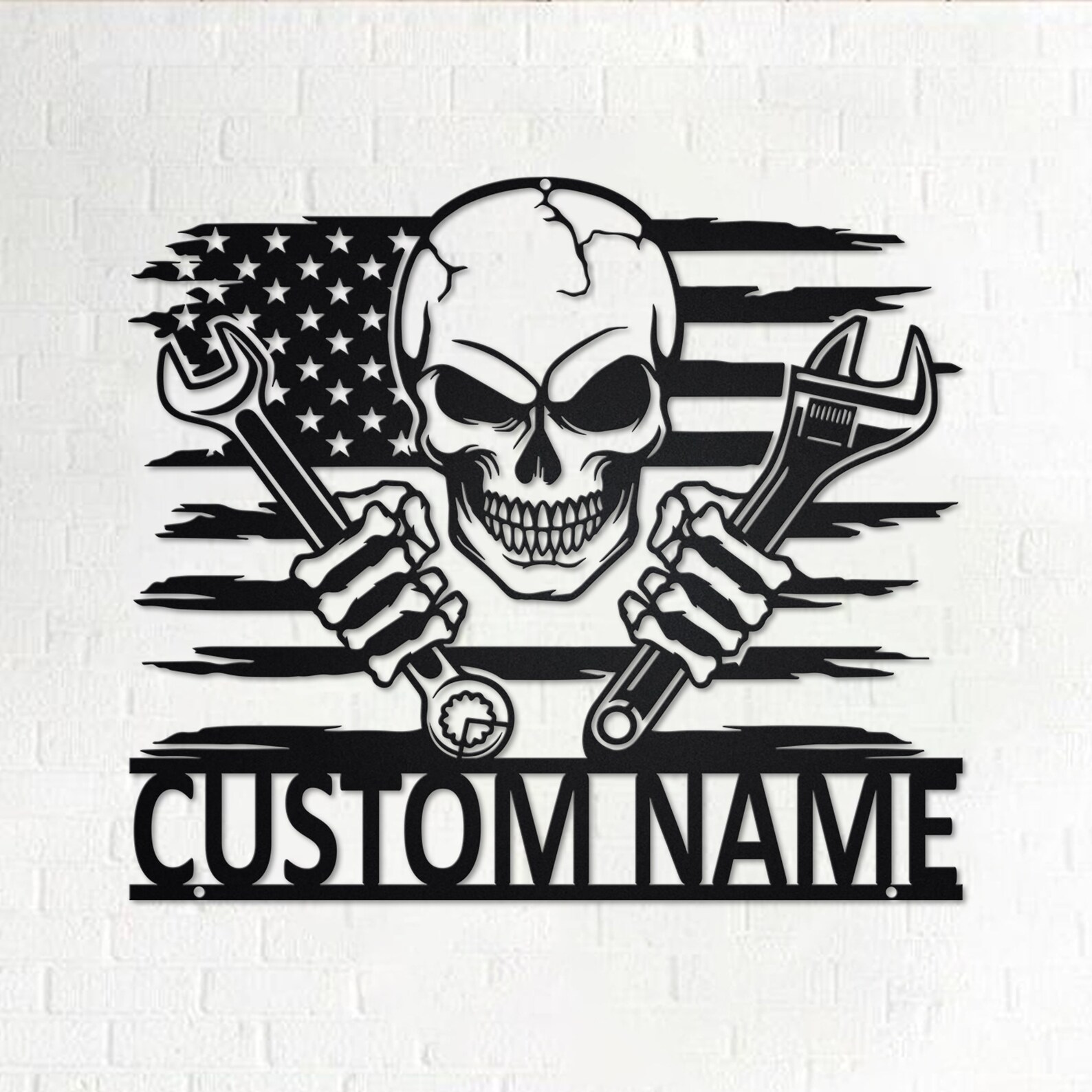 Custom US Skull Mechanic Metal Sign with LED – Garage Decor