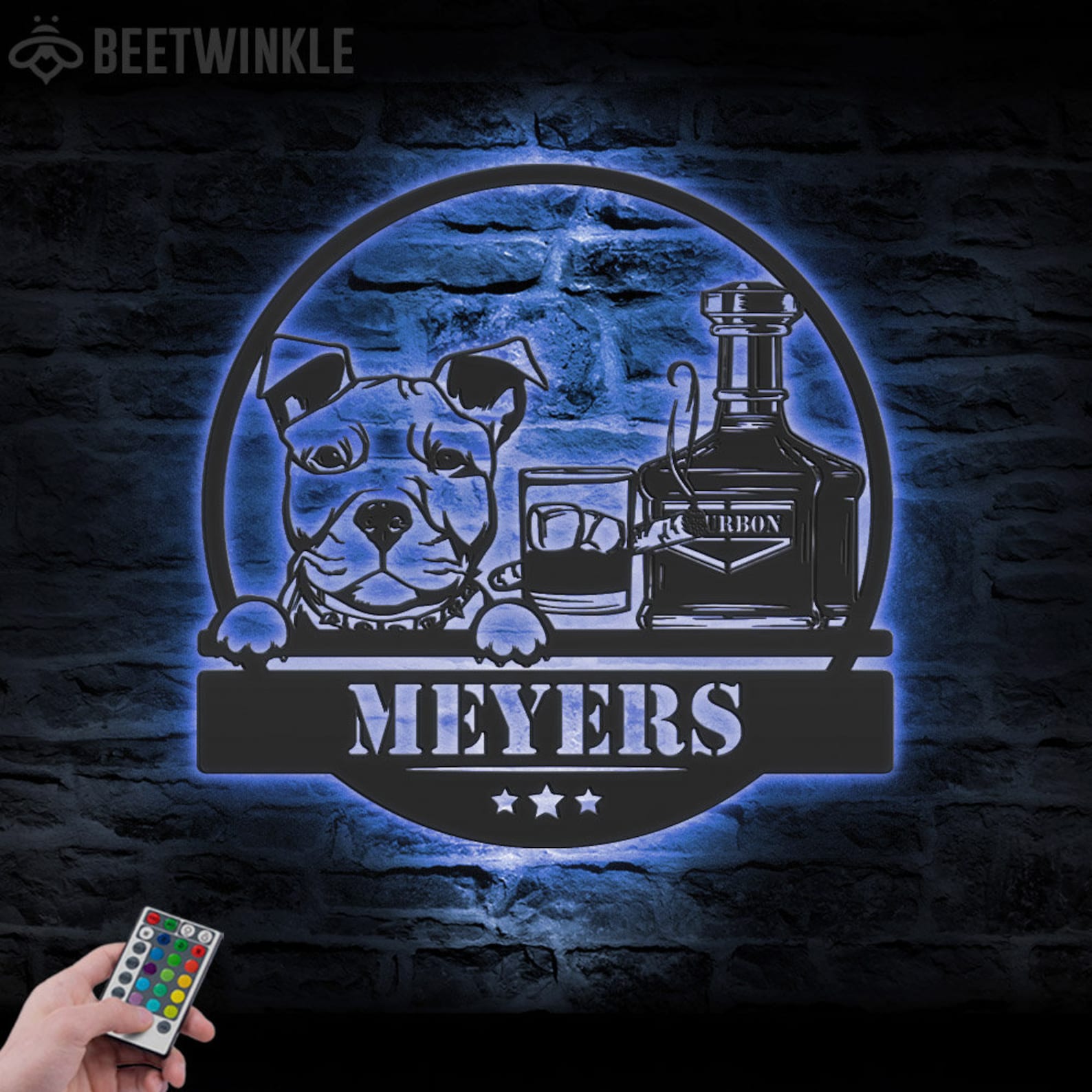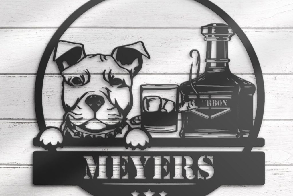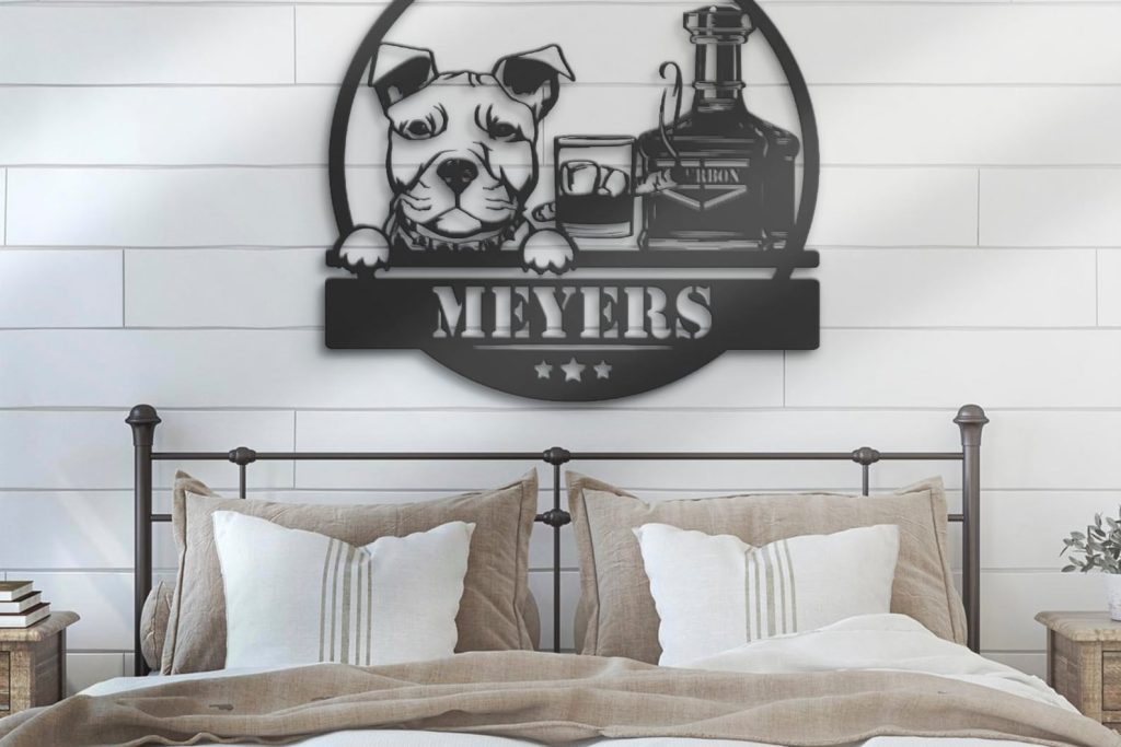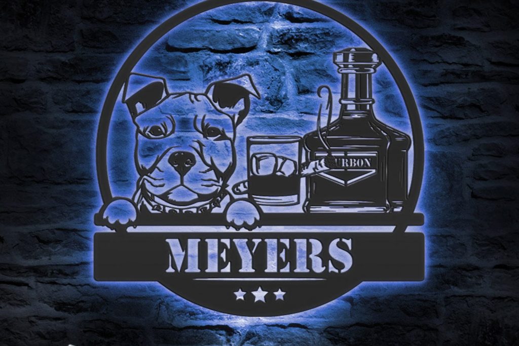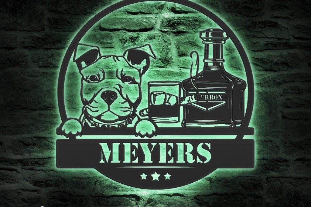 Be the first to review “Custom Whiskey Cigar and Pitbull Dog Metal Wall Art – LED Light, Personalized Sign”