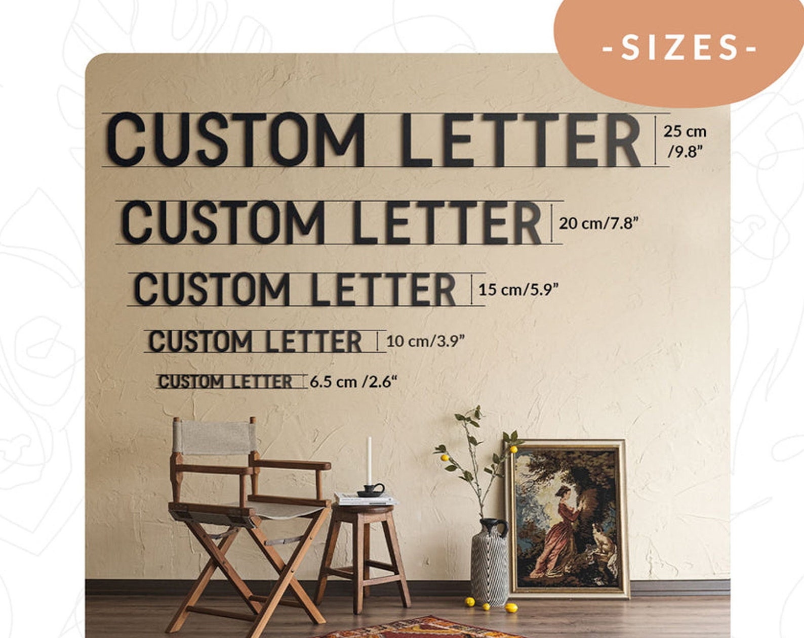 Your own custom word, phrase, quote, or lyrics. Priced per letter, punctuation marks are free. Words mount in to your wall (your order will come with instructions). They can also be mounted with clear command hooks, but I recommend inserting in to the wall for a seamless finish. Capital letters are about 6"T, depending on the letter, lowercase letters are about 2"T, depending on the letter. Larger sizes are available, message me for a custom order. Words longer than 23 inches wide will not be one continuous line, but can be installed to appear like they are.
