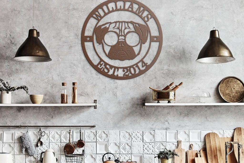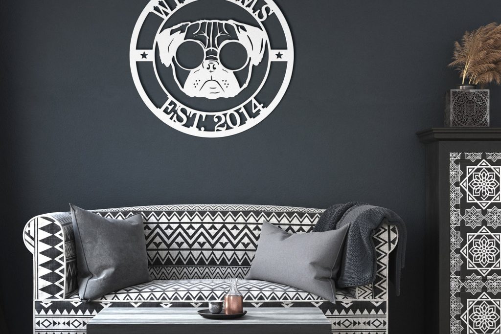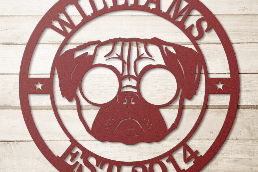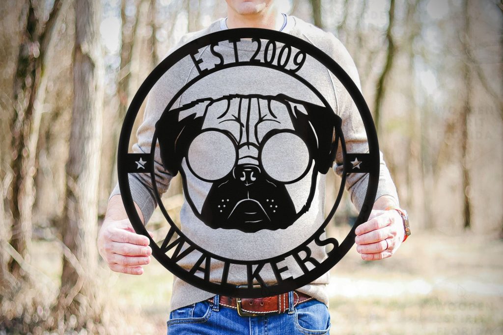 Cute Pug Dog Art Decor – Personalized Name Wall Sign, Custom Metal Monogram
