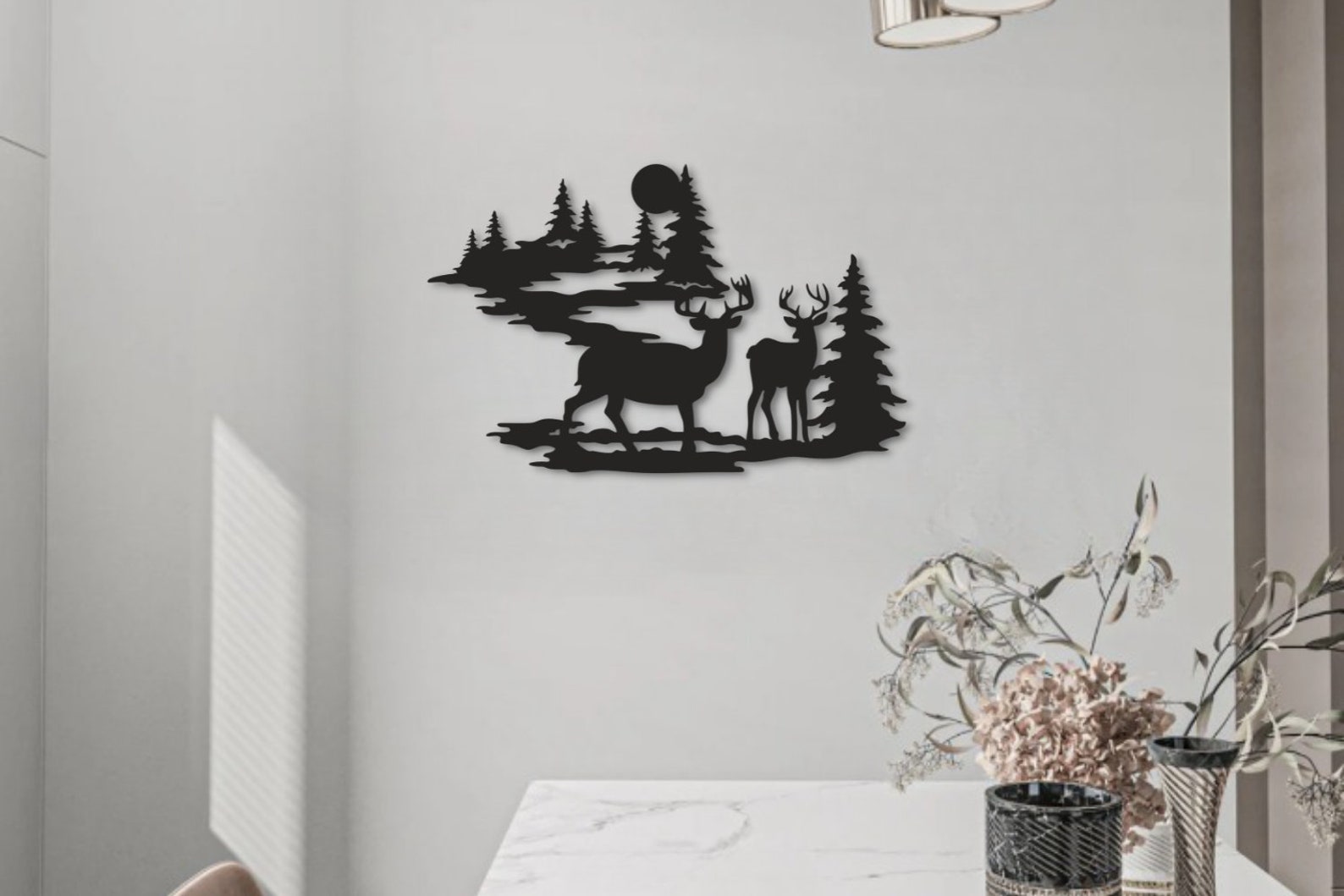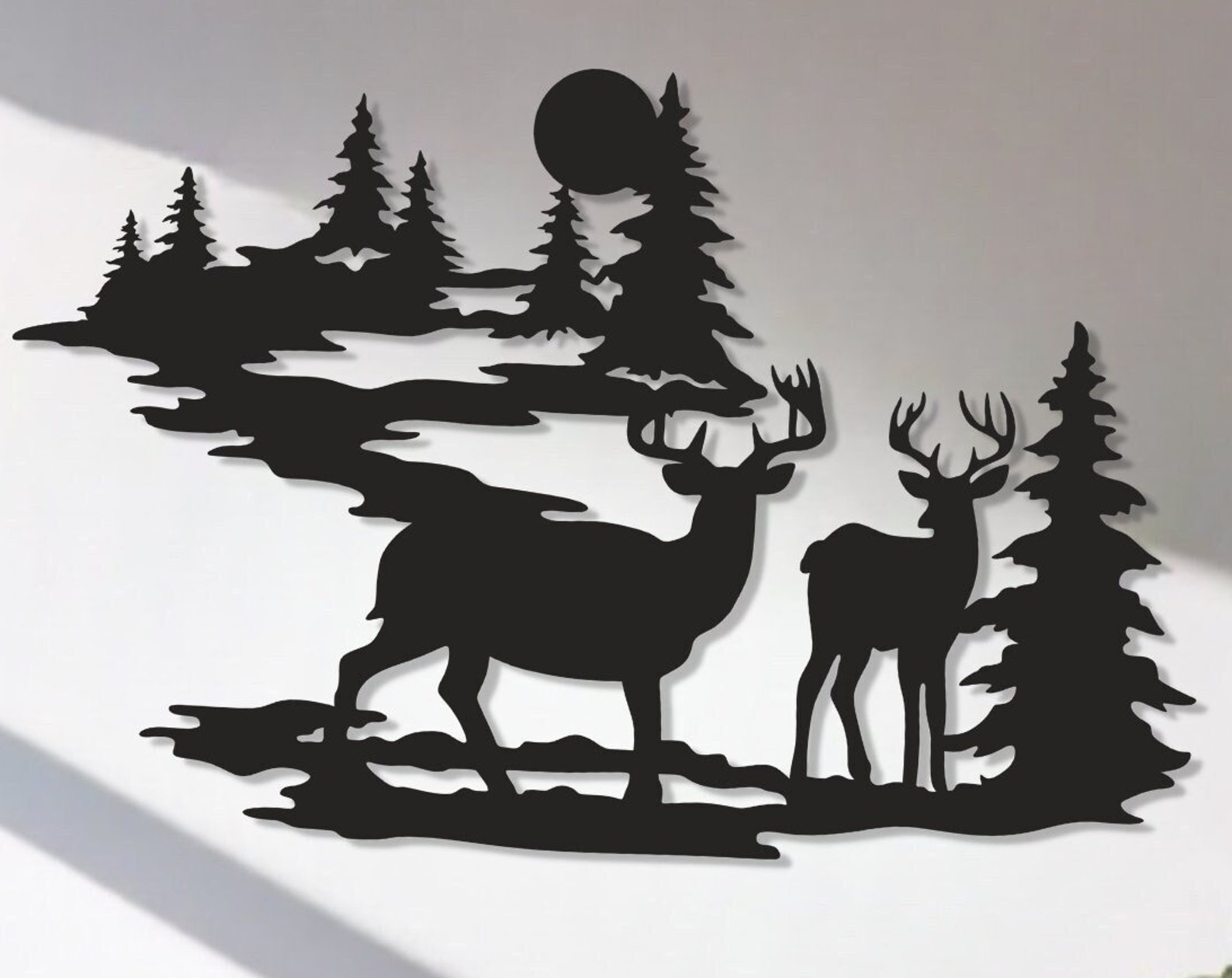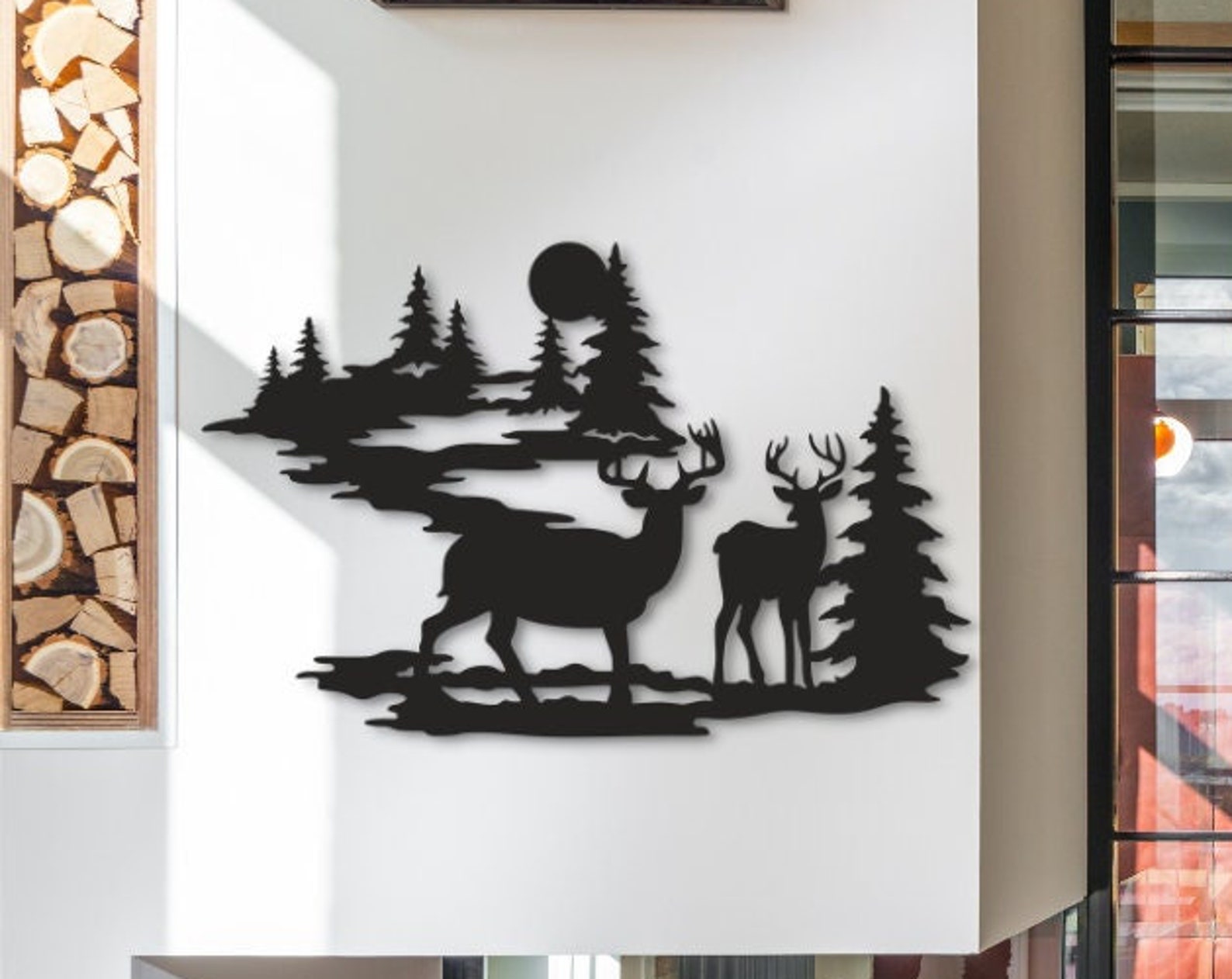 -Enjoy a cozy and rustic atmosphere with this deers in pine trees metal home panel.