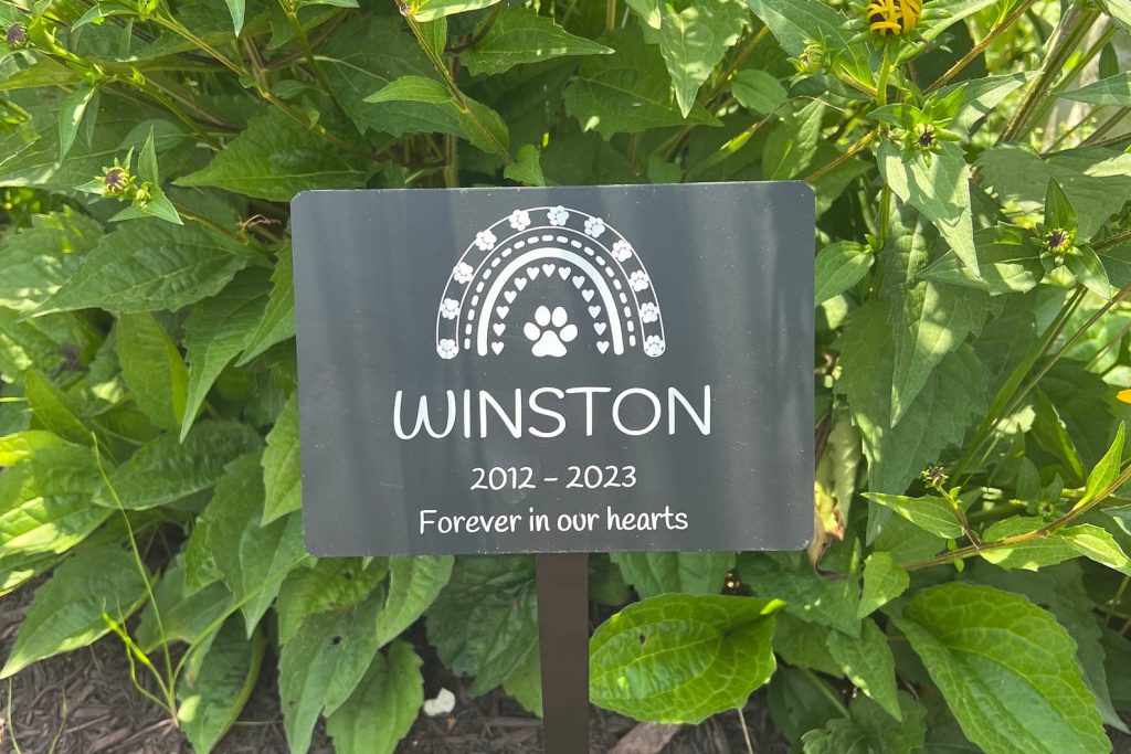 7"L x 5"H- Engraved black metal plaque and stake. Engraved with rainbow design shown. Add your custom name, date and quote.