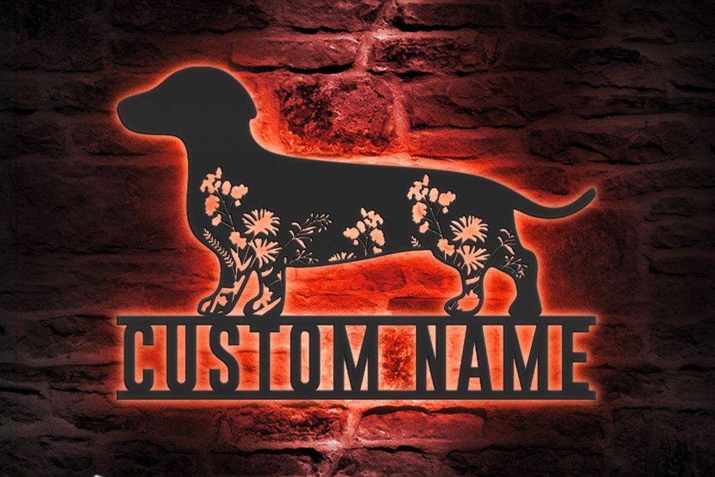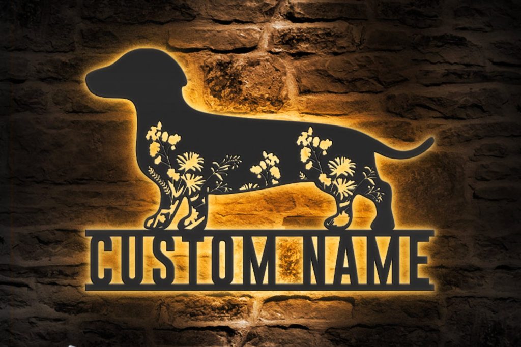 Be the first to review “Floral Dachshunds Art – Personalized Metal LED Dog Wall Sign”