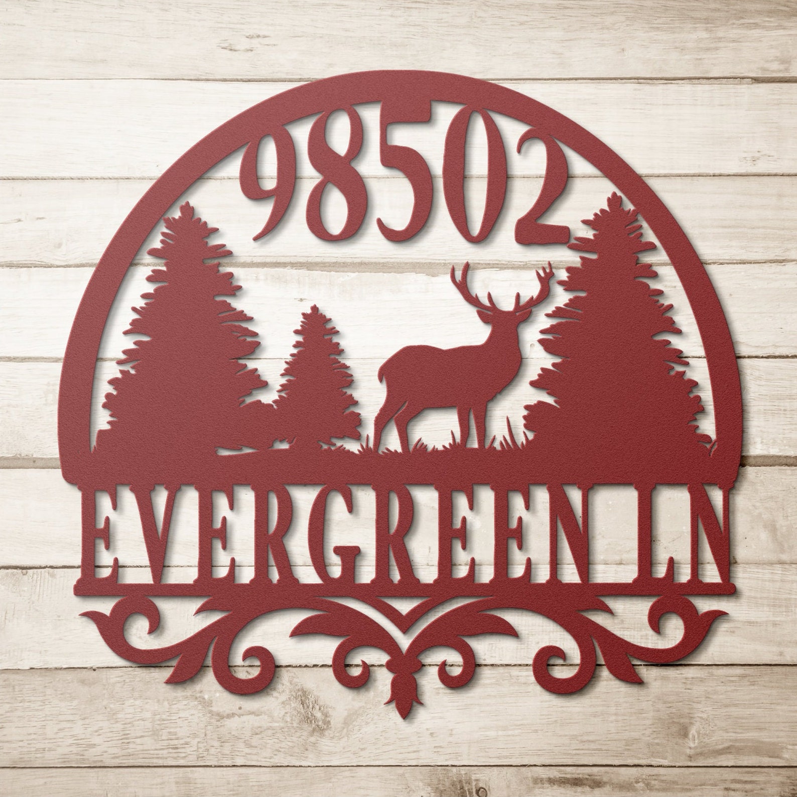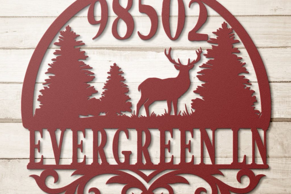 Forest, deer metal address wall hanging. Elevate your home decor with a beautiful metal wall sign. Made with 18 gauge steel and powder coated in your choice of 5 colors, this sign is built to withstand the elements for years of enjoyment. Add a touch of elegance to your home on the inside, outside, or both!
