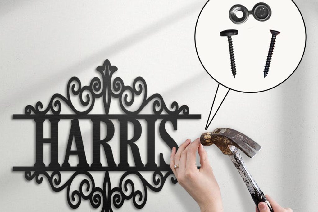 asy to hang — You will receive a name sign with nails and screws. There are holes for you to hang metal signs. You just need to find a suitable place and position it with a hammer. The design of two or more holes can make the name sign more stable, dont worry about it falling or something. The nut can hide the screw without affecting its beauty.