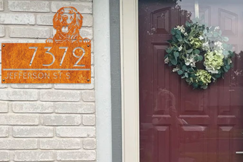 Custom Golden Retriever Metal House Number Sign, Horizontal Metal Address Sign, Dog Address Sign, Outdoor Number Plate, Housewarming Gift.