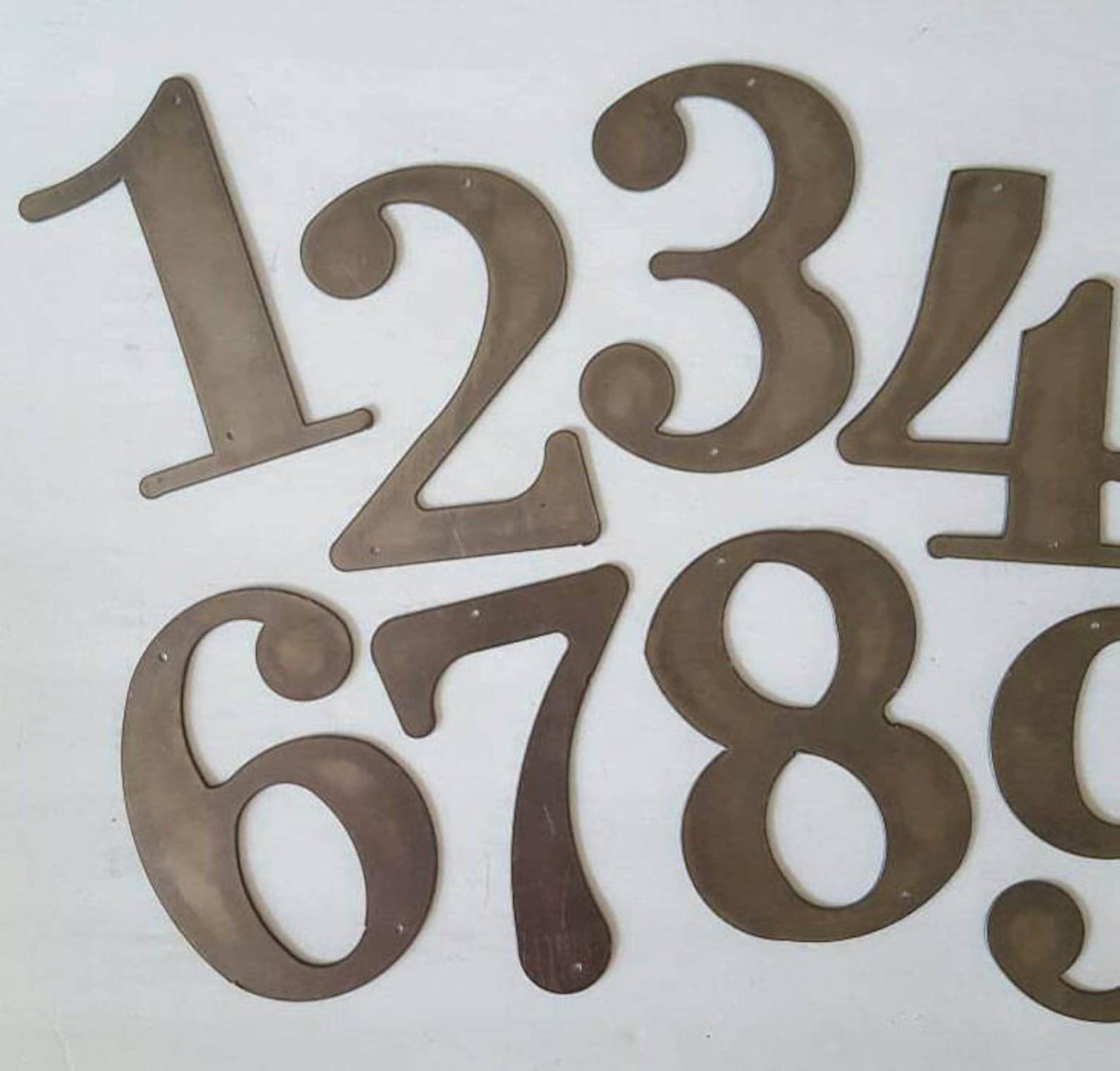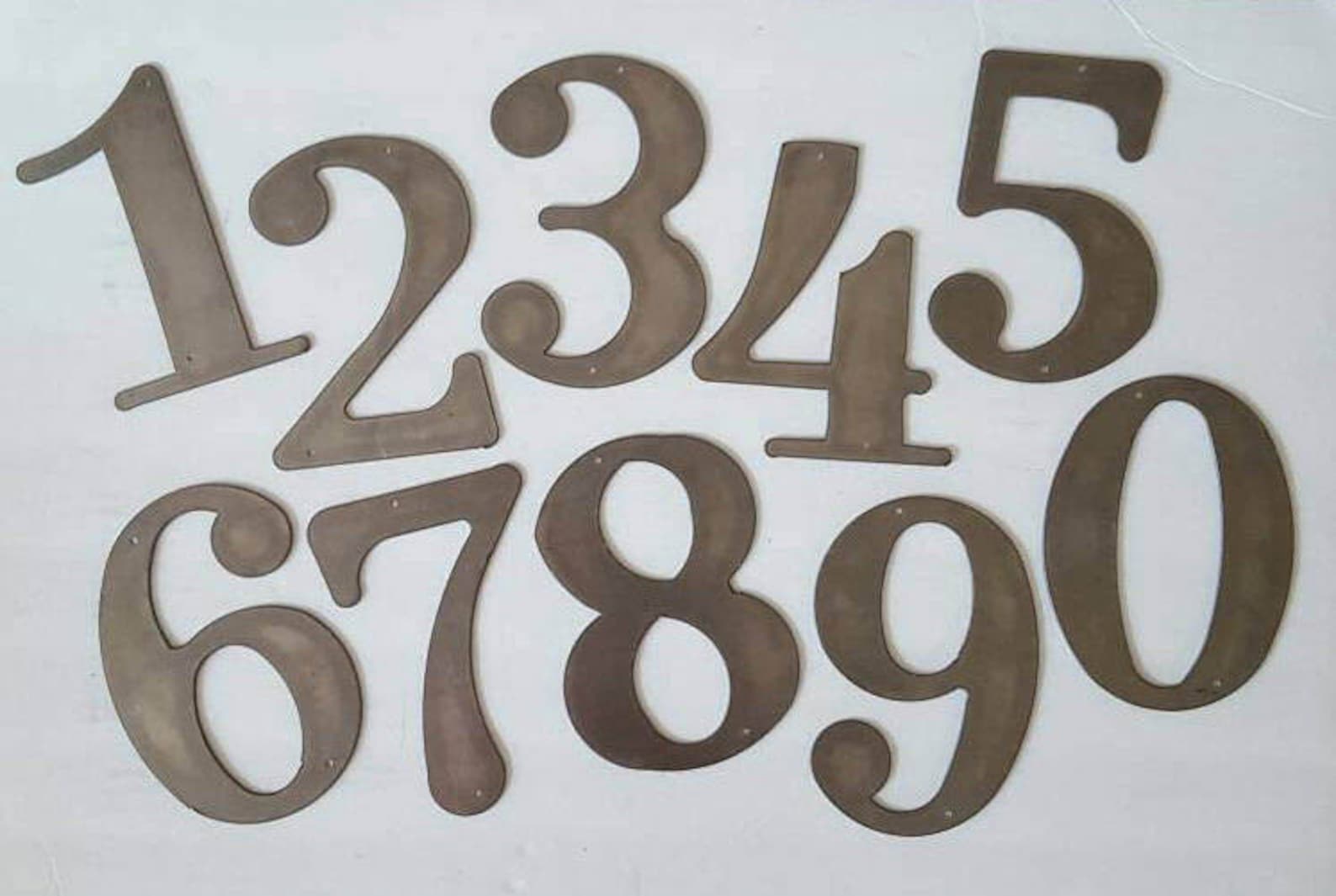 Large Metal House Numbers & Letters are approx. 10" high. Choose unpainted or painted with black rustoleum paint, Hammer Gray, or White. (Shown unpainted). 14 Gauge metal. For Home or Office. Apartment numbers, door numbers, etc. Also great shelf decor. Birthday, Christmas, or Housewarming gift. Holes drilled in them for hanging. Put in the personalization the numbers you need