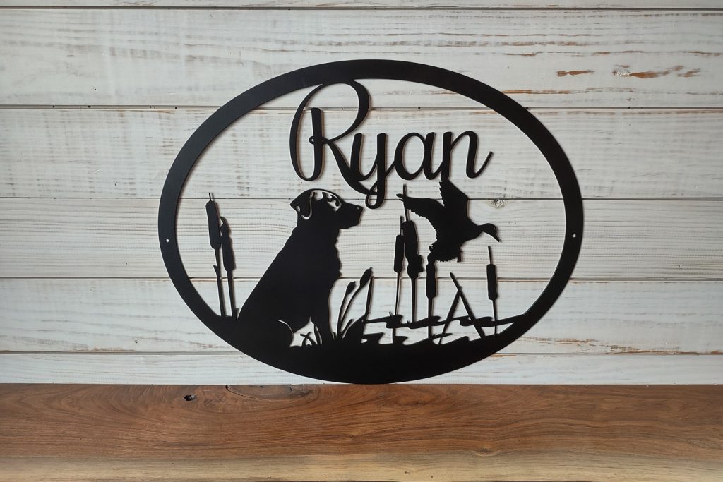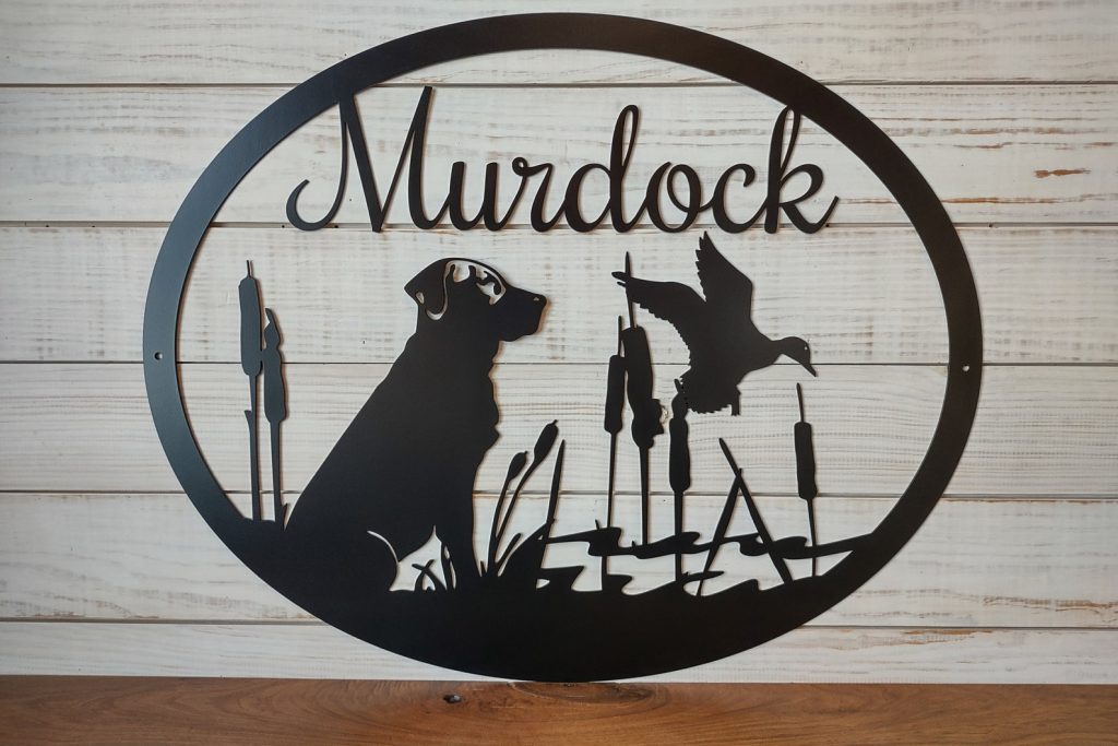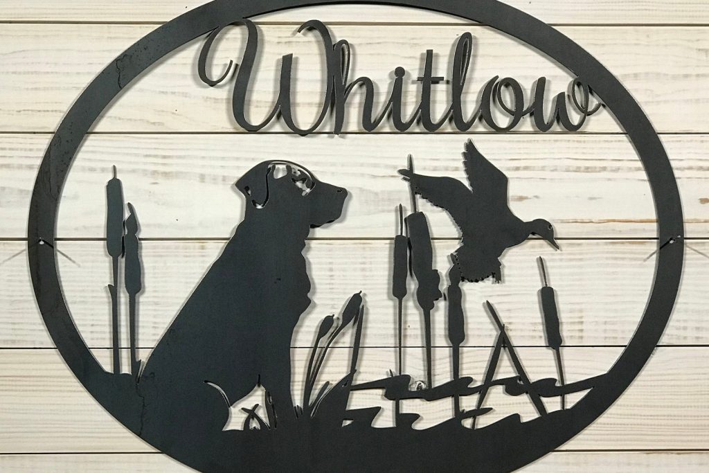 Personalized Large Metal Dog and Duck Hunting Scene – Welcome Sign – 24 inch Rustic Metal Decor
