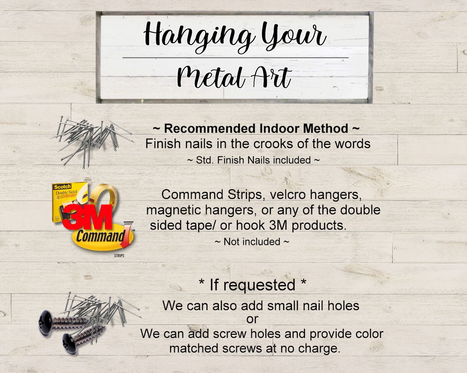 ~ This piece comes standard with nails for hanging and no holes (3M tape can also be used)