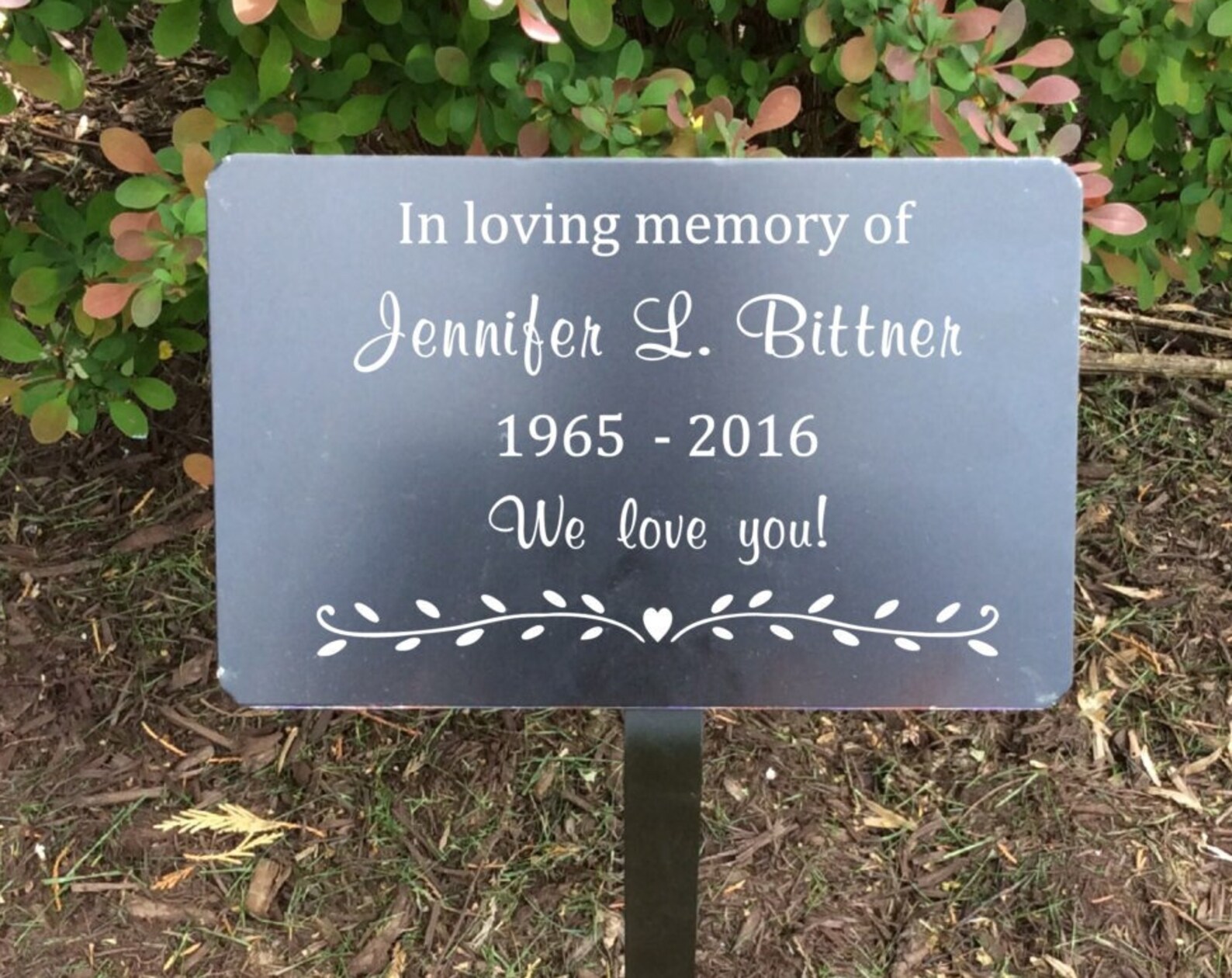 Engraved black metal plaque and stake. 7"L x 5"H comes with a 20" stake. Our metal ID plates are commercial grade. They will not rust or fade and will last years outdoors. 20 long Stake is incl