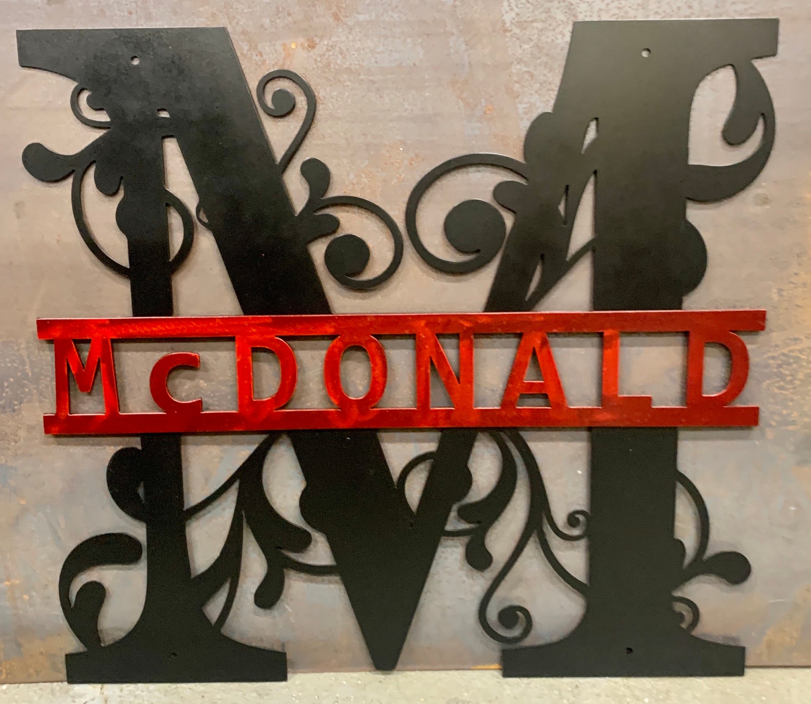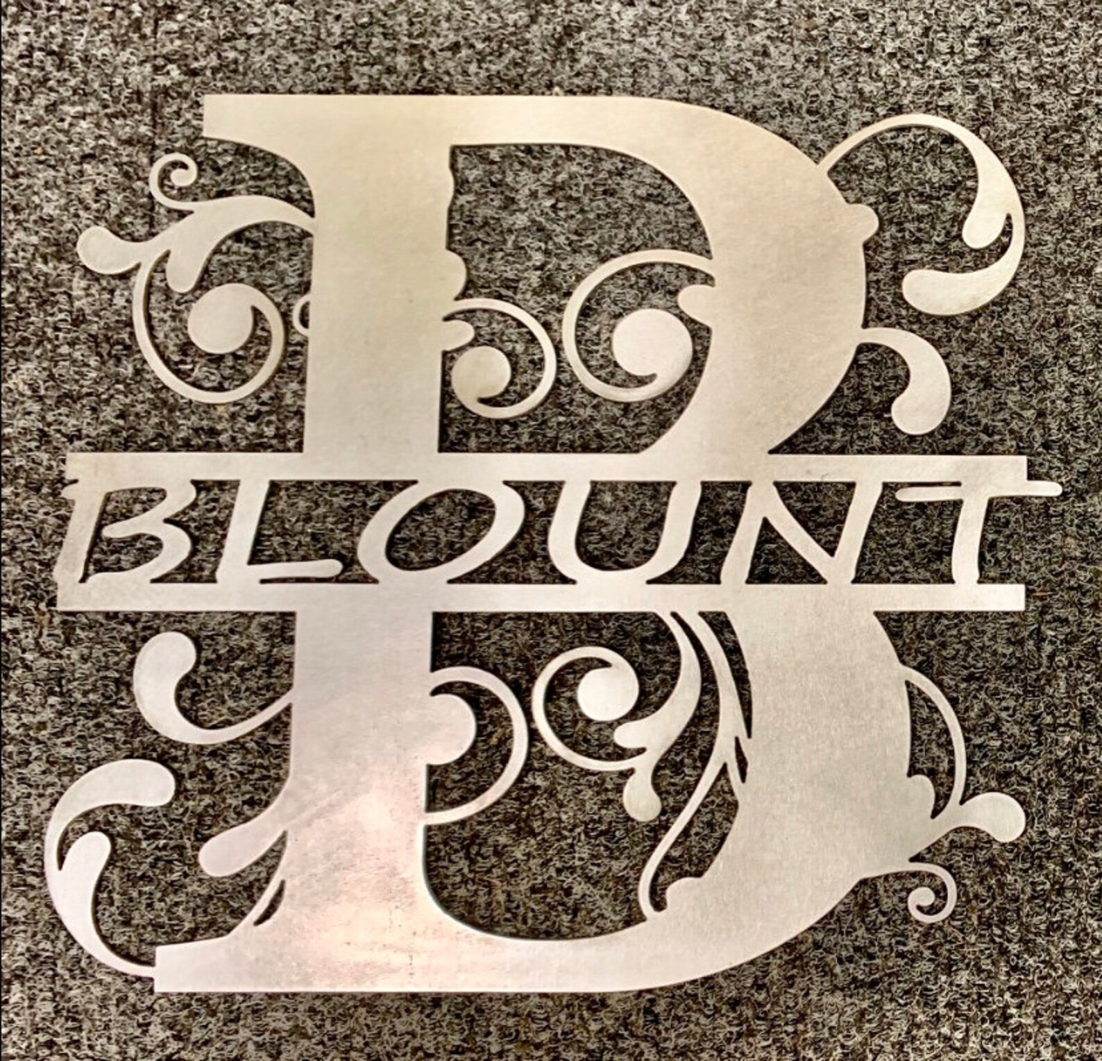 This listing is for a monogram door sign made from 16 gauge steel. It will be powder coated your choice of color from the drop down. A-Z on the letter and the last name. The sign measures 18 inch x 18 inch and are all made and powder coated in house.