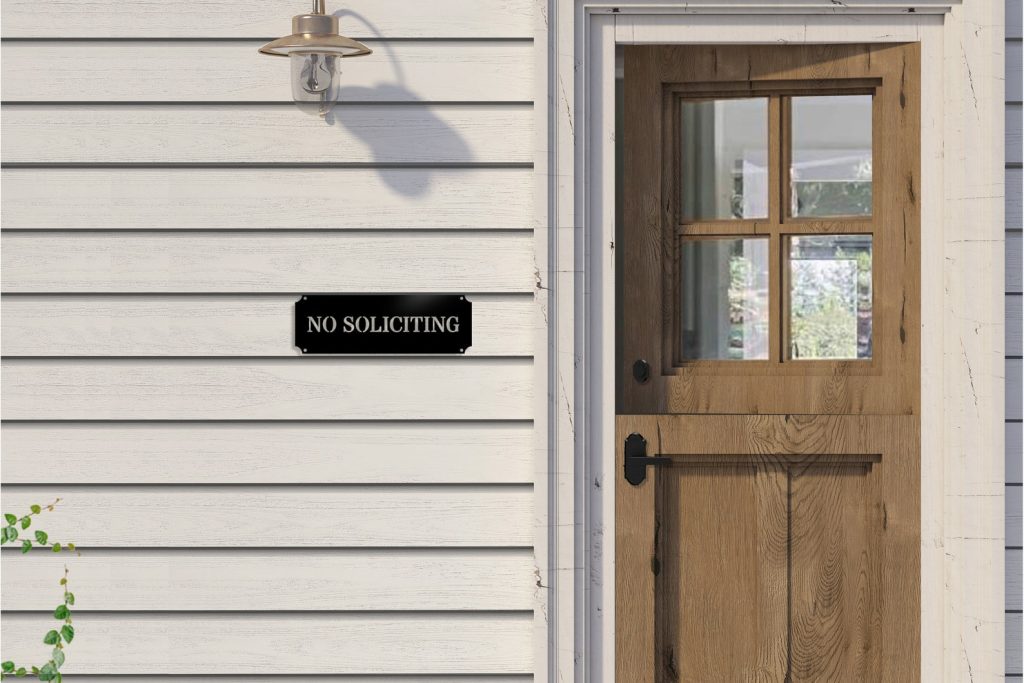 Keep pesky salesmen away with this custom metal sign! This No Soliciting Sign makes a great door hanger or wall hanger, and comes with pre-cut holes for easy mounting.