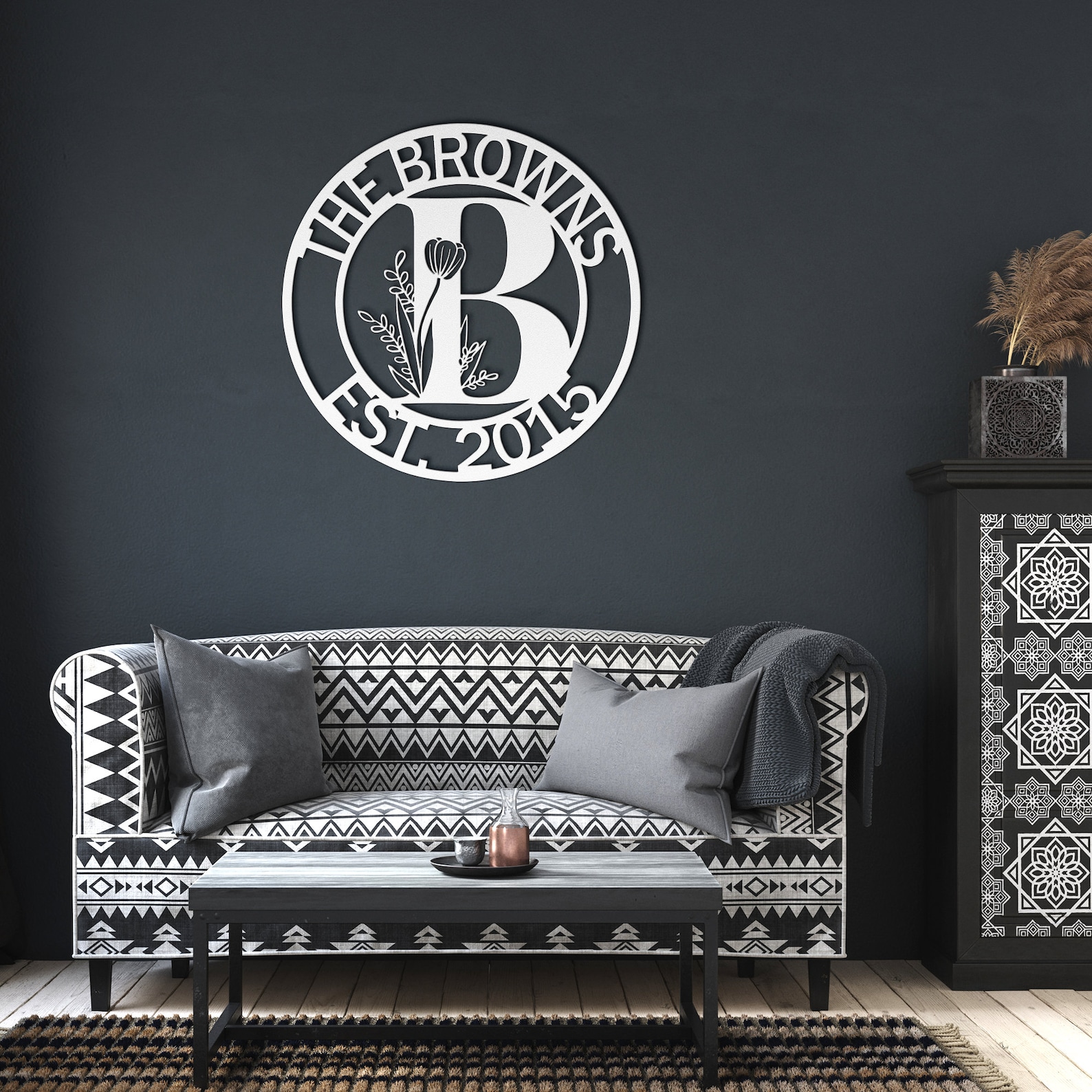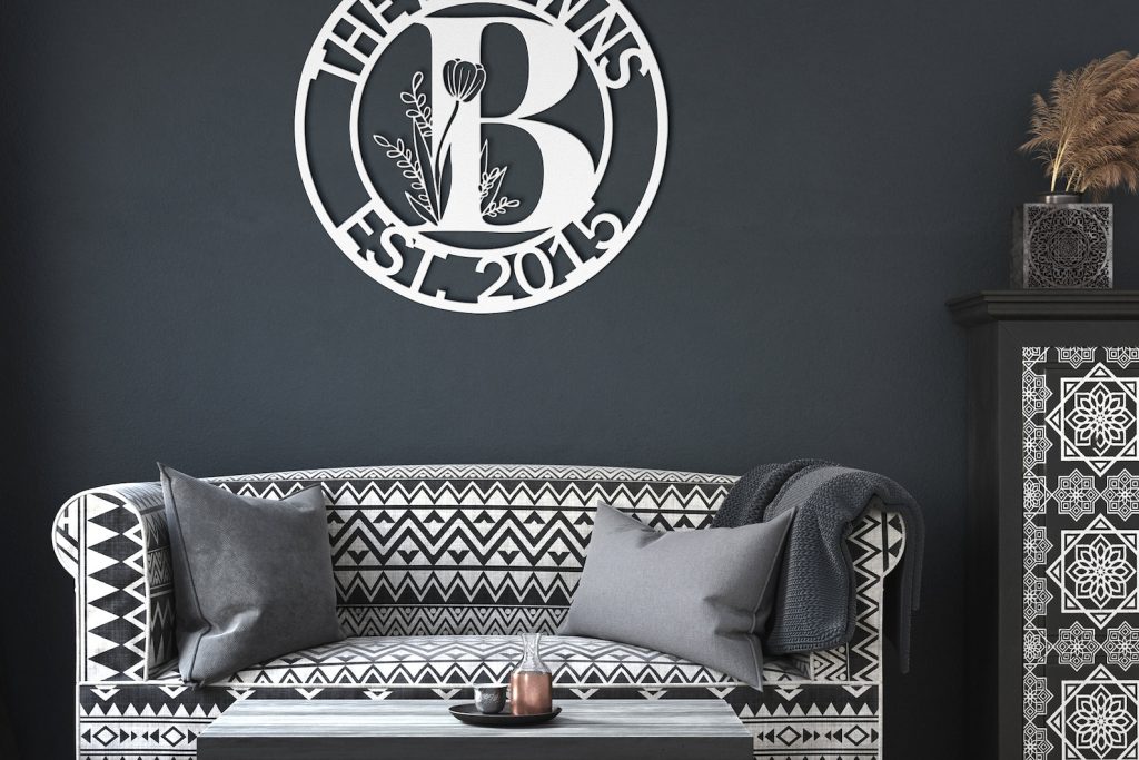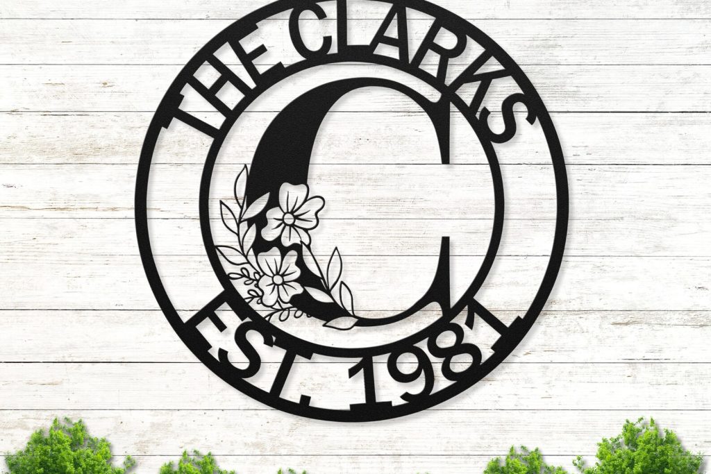 Custom Metal Sign that you can personalize to read anything on the top and bottom, makes it a perfect housewarming or wedding gift. The floral initial in the middle makes it a modern and beautiful wall art to hang on the door or on the gate.