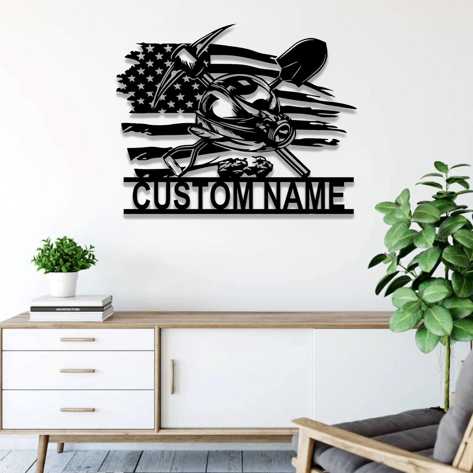***Personalized Miner Metal Name Sign | Custom Coal Mine US Flag Metal Wall Art | Miner Cave Decor | Gift For Him | 8-24 in***