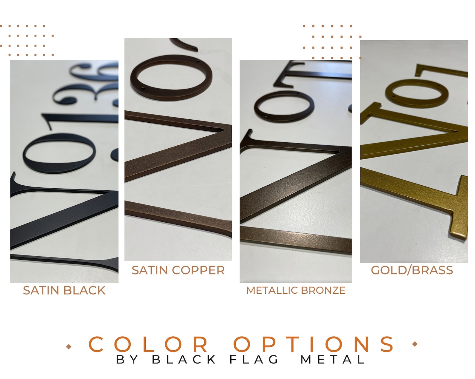 These numbers come with our premium exterior grade powder coating. Our standard colors are Satin Black, Satin Copper, or Metallic Bronze.